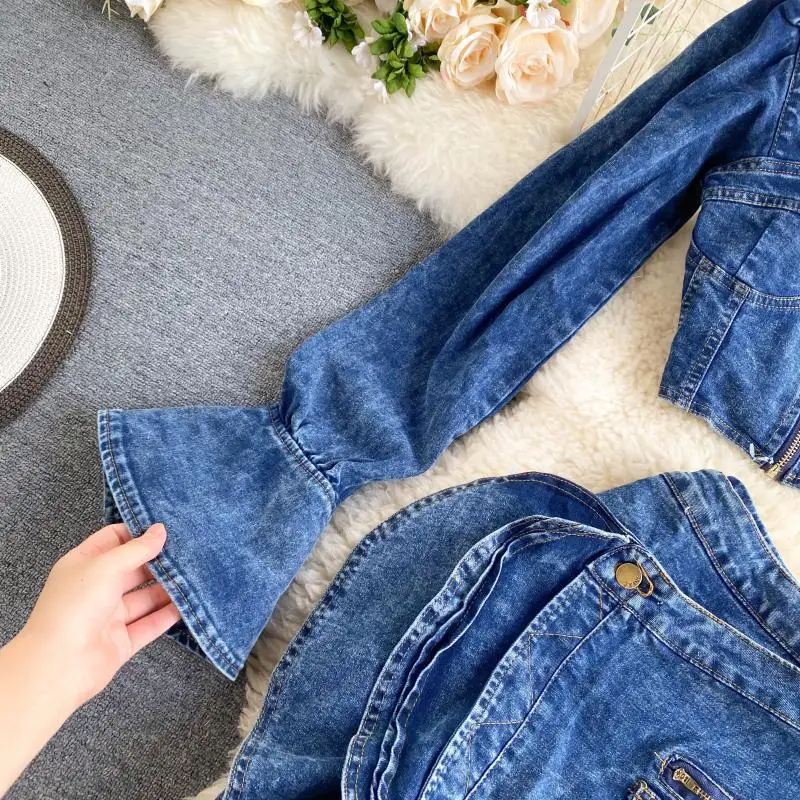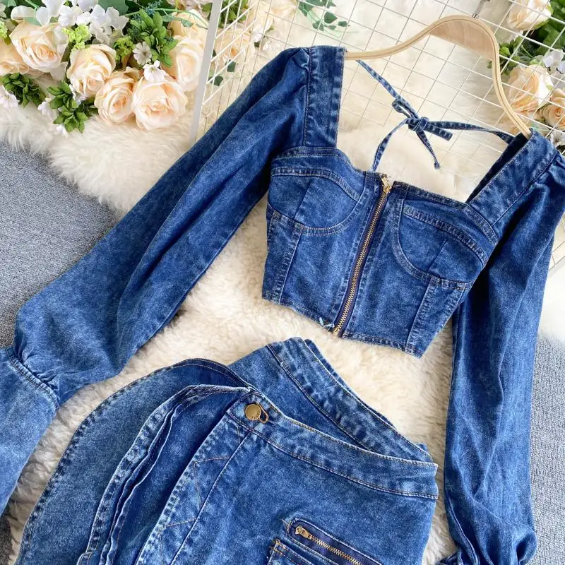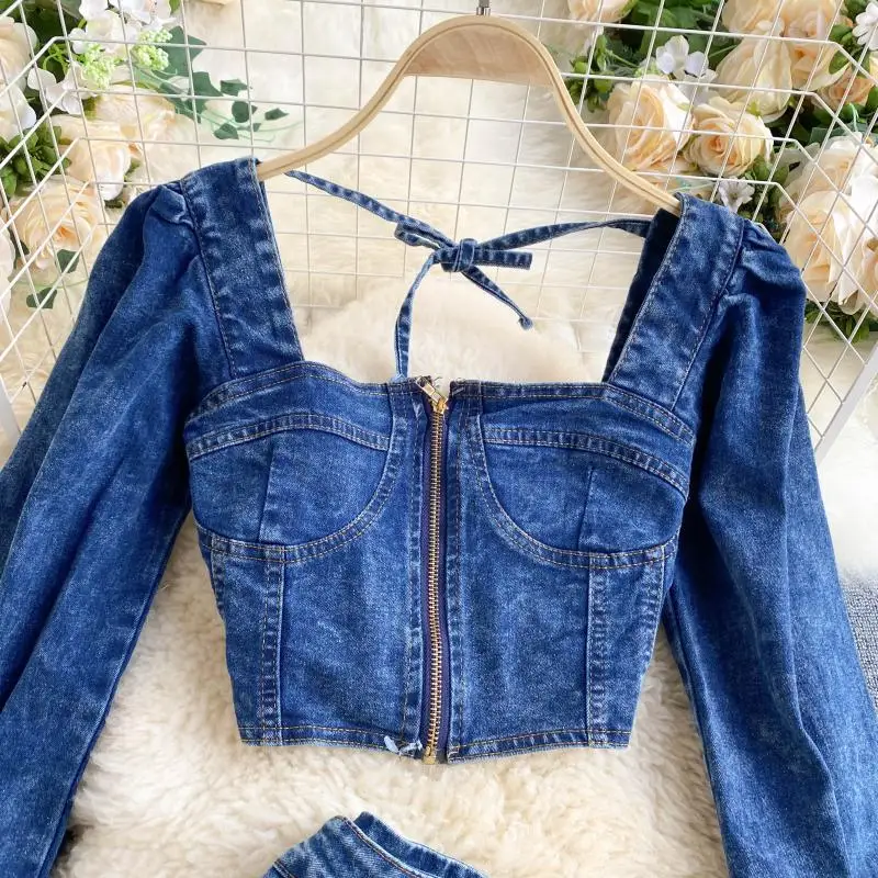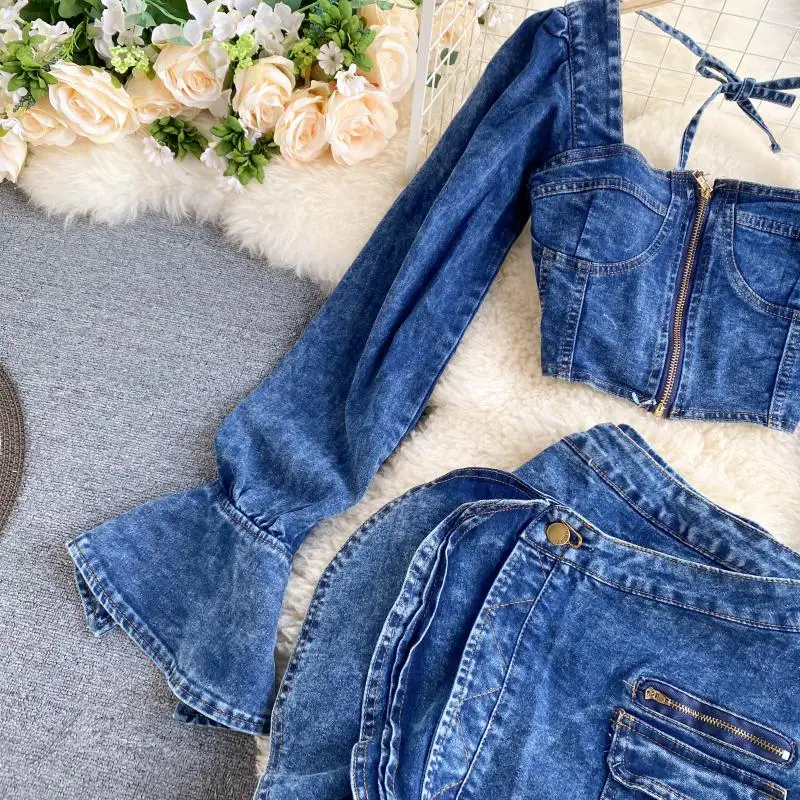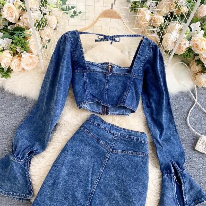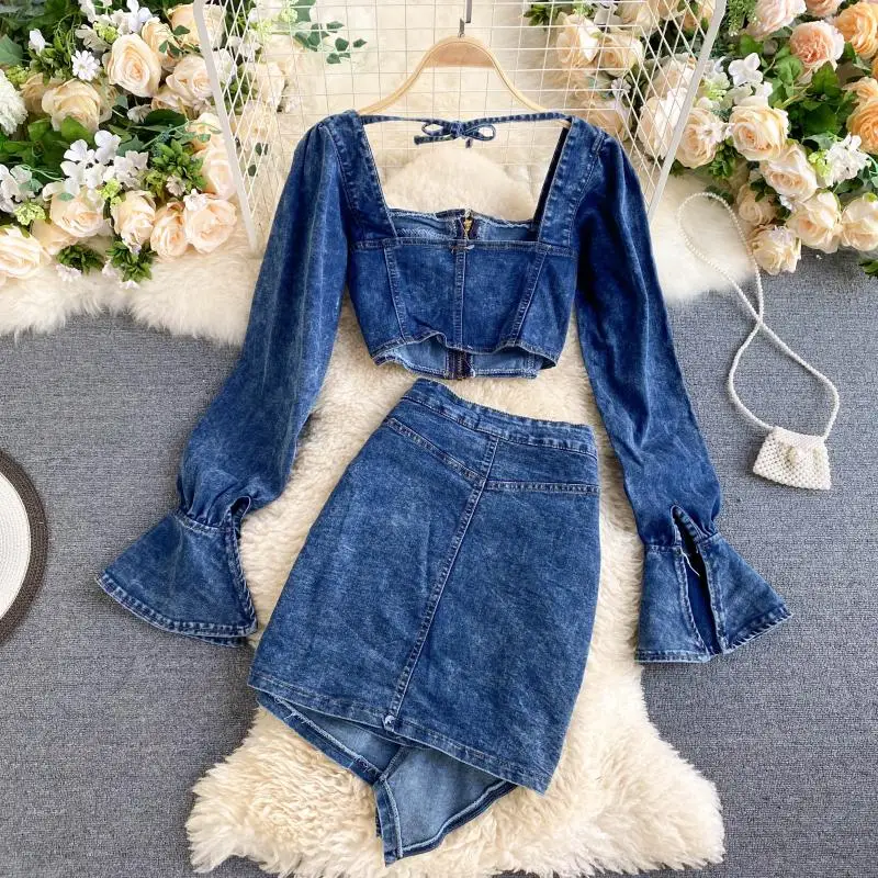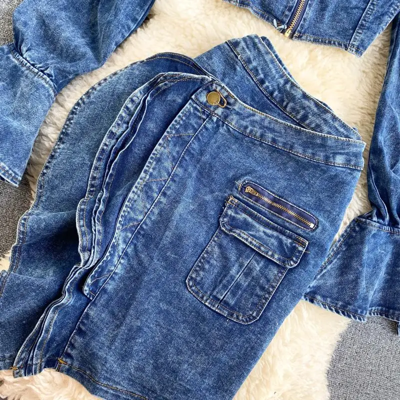 Be the first to review “Two Piece Set Women Sexy Jeans 2 Two Piece Set Long Sleeve Crop Tops And Bodycon Short Denim Skirt Suits for Woman”
