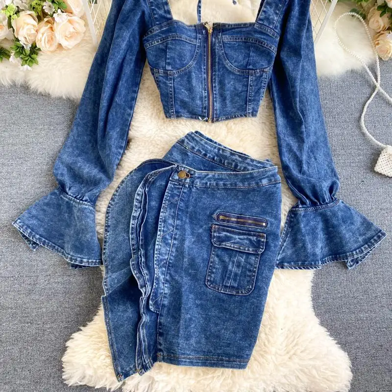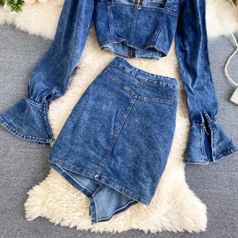 Two Piece Set Women Sexy Jeans 2 Two Piece Set Long Sleeve Crop Tops And Bodycon Short Denim Skirt Suits for Woman