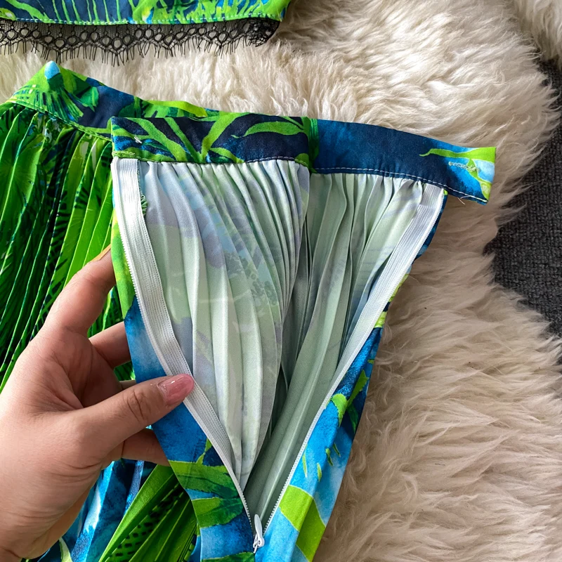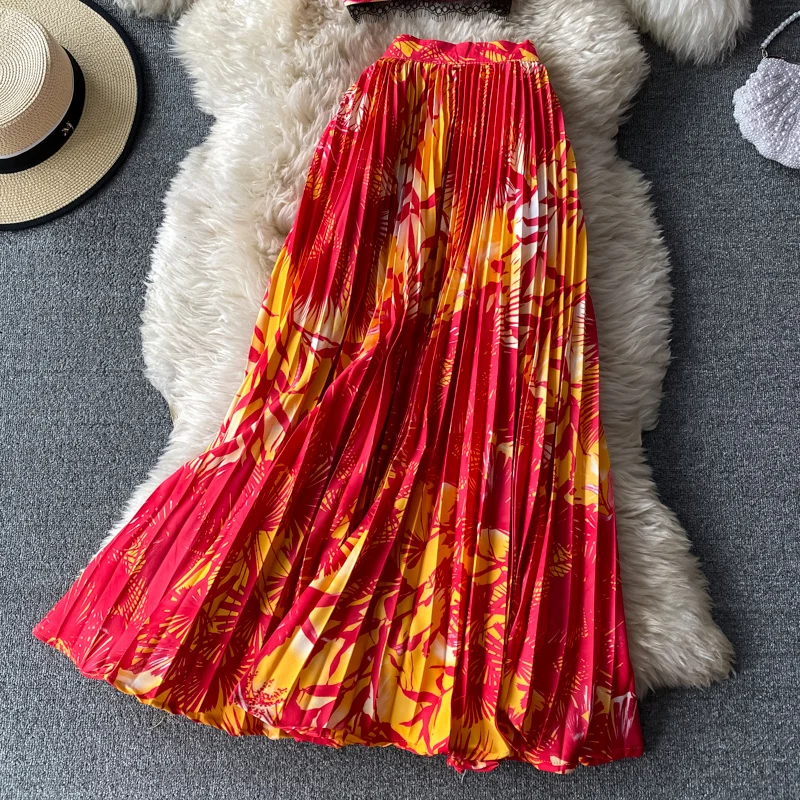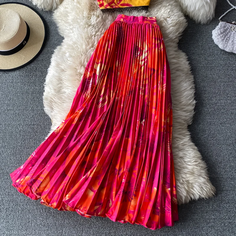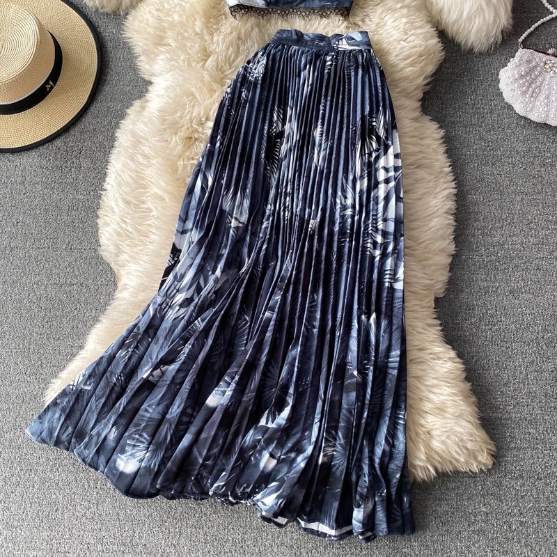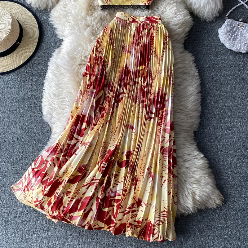 Summer Boho Two Piece Set Women Holiday Beach Elegant 2pcs Set Strapless Crop Tops And High Waist Pleated Long Skirt Suit