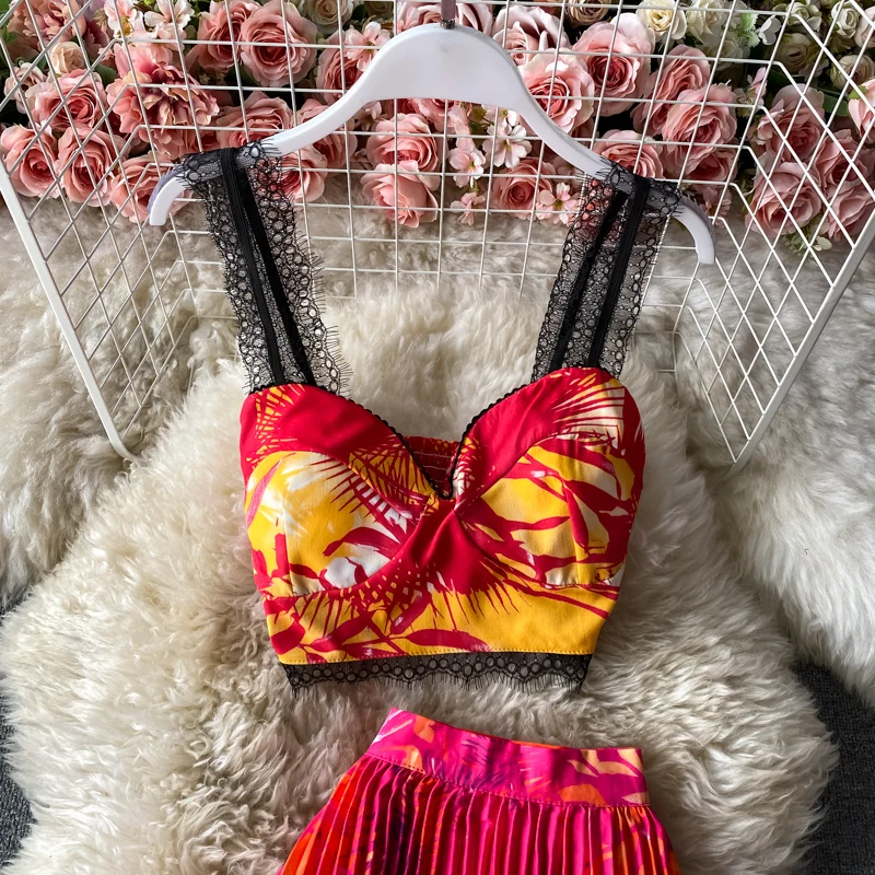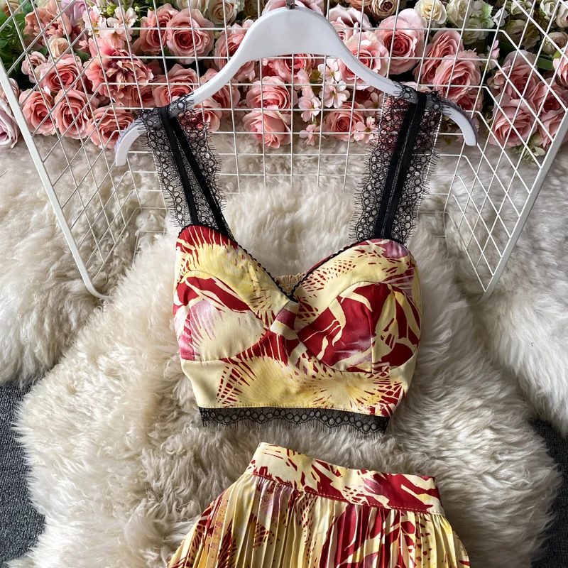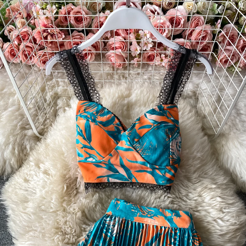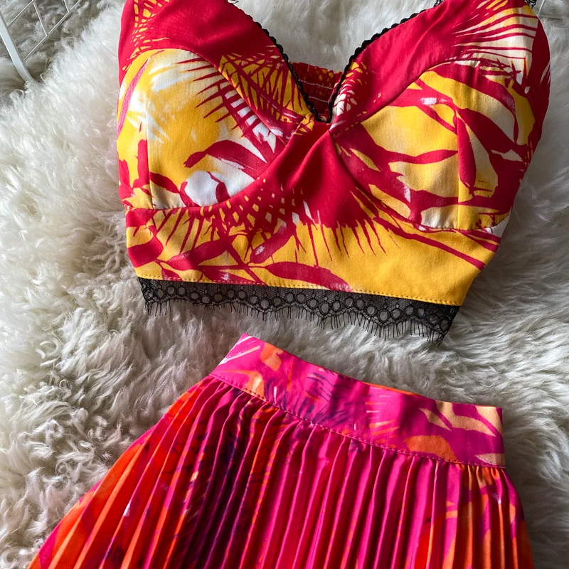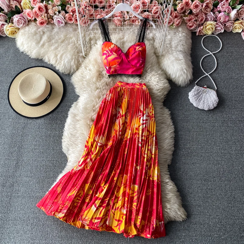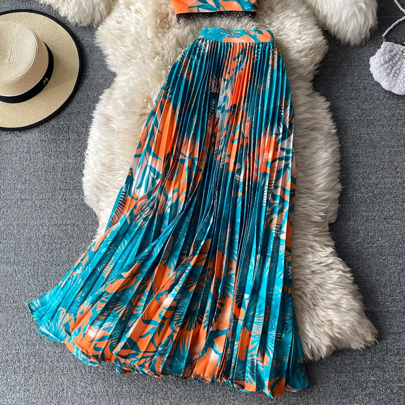 Be the first to review “Summer Boho Two Piece Set Women Holiday Beach Elegant 2pcs Set Strapless Crop Tops And High Waist Pleated Long Skirt Suit”
