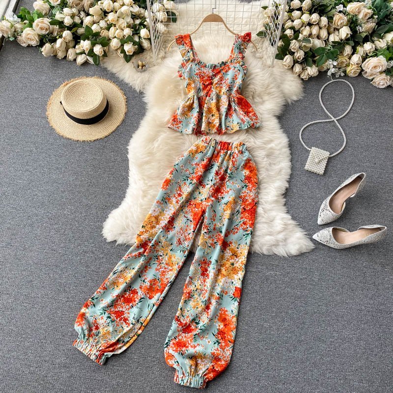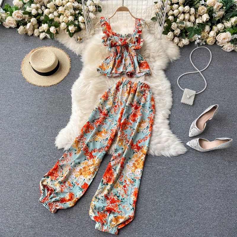 Be the first to review “Summer Two Piece Set Women Floral Printed Sleeveless Elasticity Crop Top And High Waist Long Pants Suits Boho Clothing”
