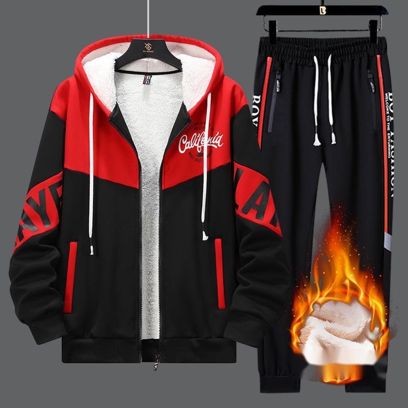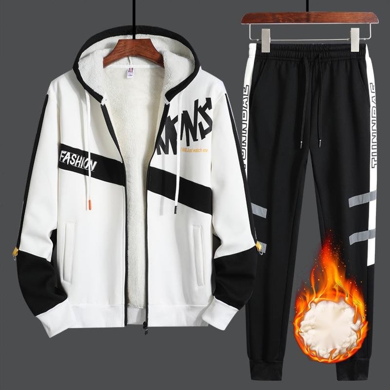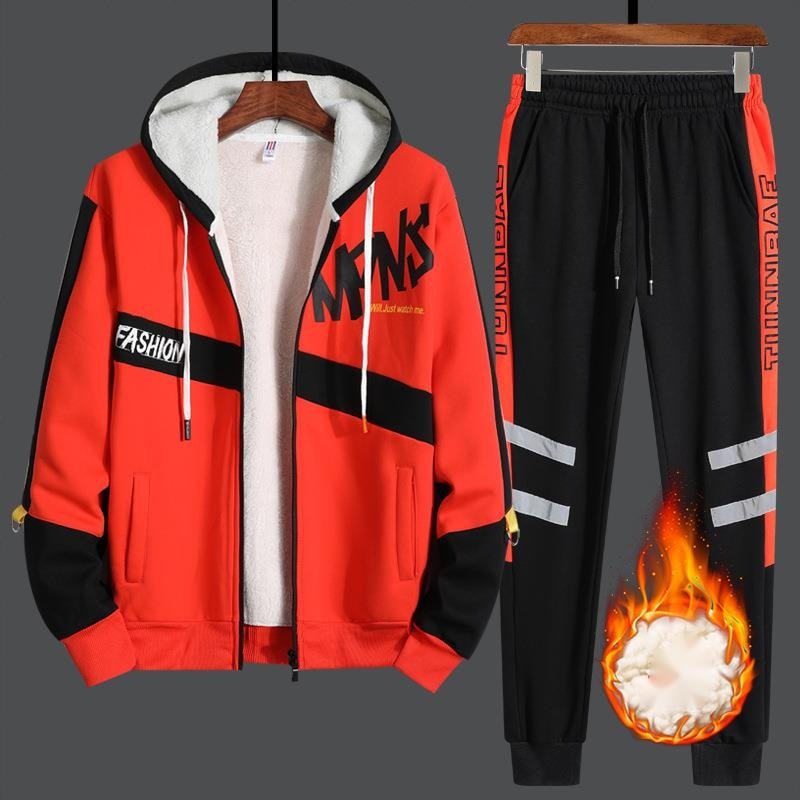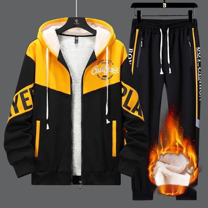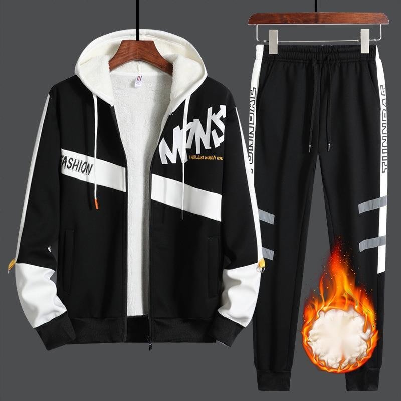 Men Patchwork Printing Winter Fleece Warm Tracksuits 2 Pc Sweat Suits Mens Sweatshirts Sweatpants Sets Husband Clothing