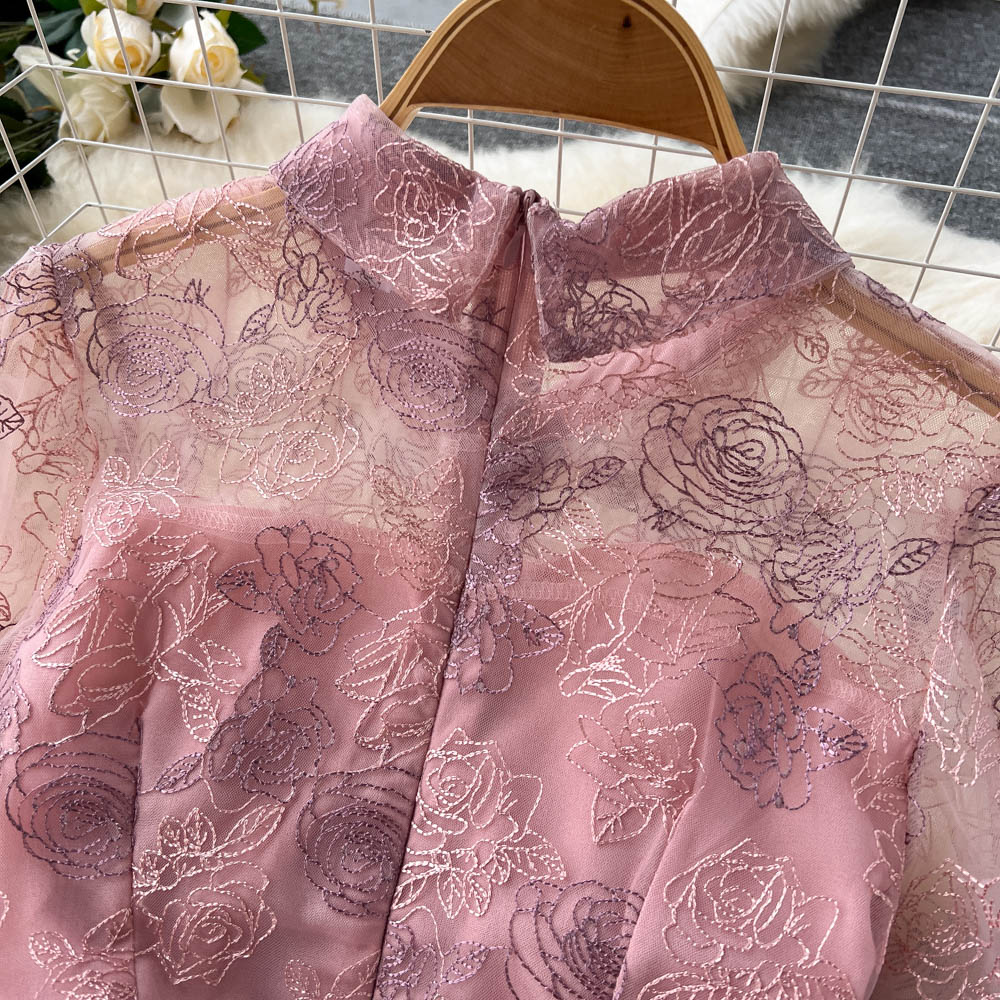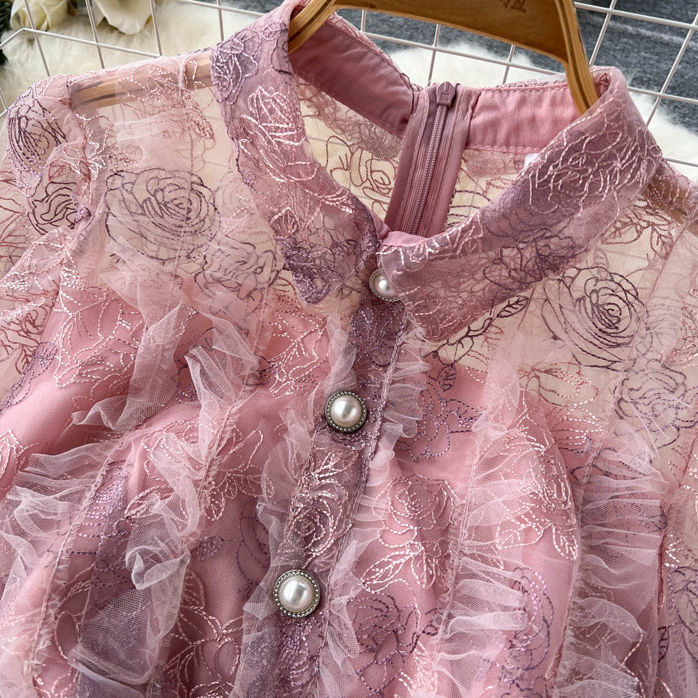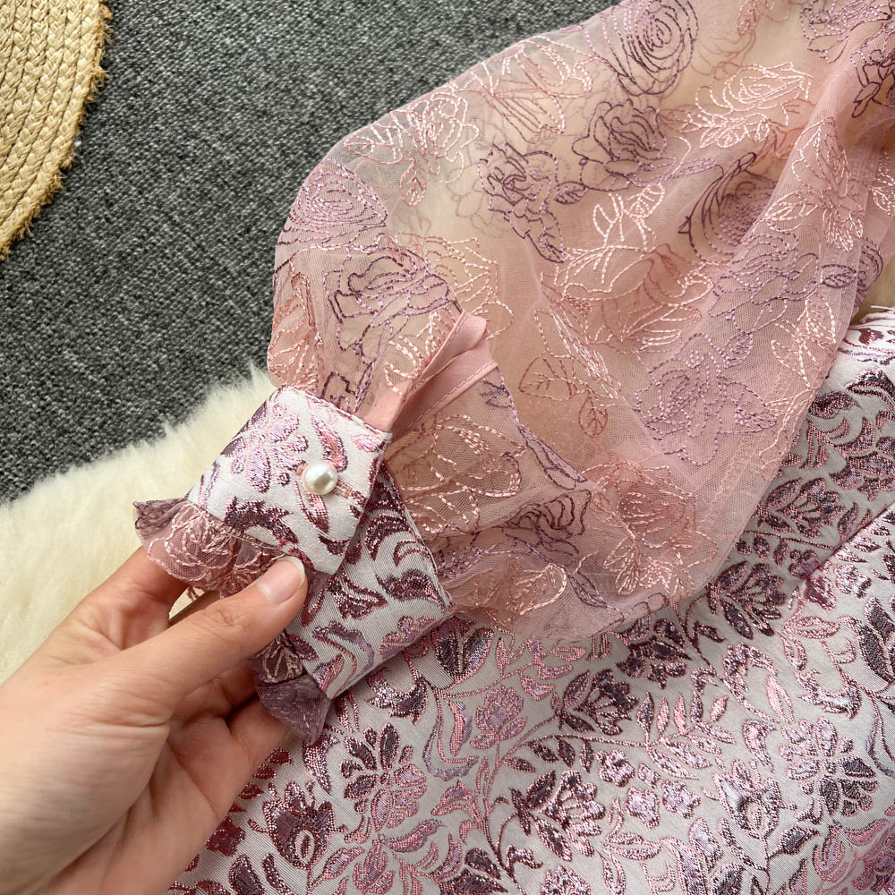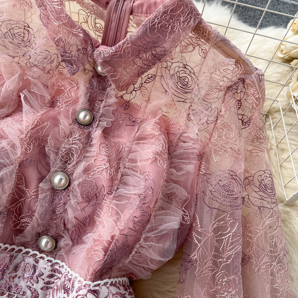 Runway Summer Flower Jacquard Dress Women’s Lantern Sleeve Lace Ruffles Mesh Embroidery Vintage Party Vestidos