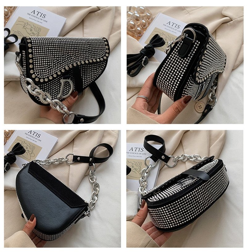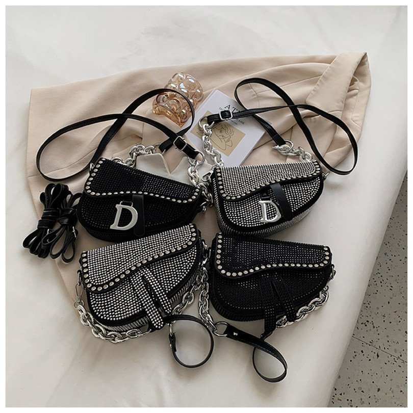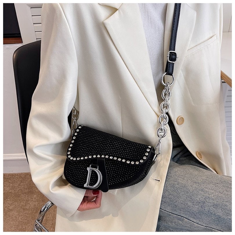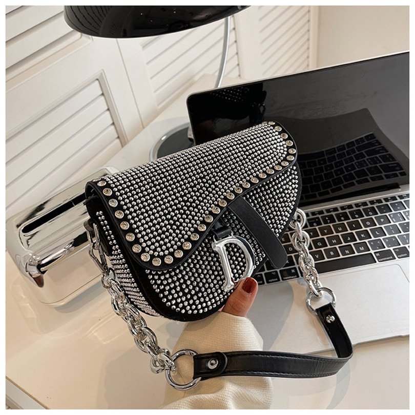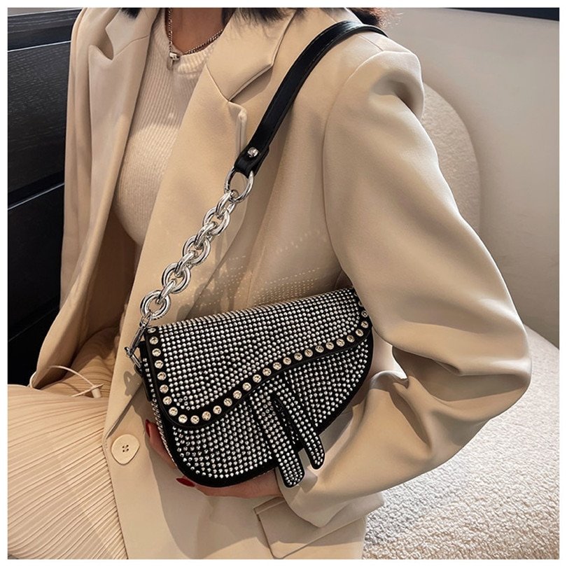 Women’s bags fashion thick chain bright diamond saddle bag female carrying armpit fashion luxury brand design bag
