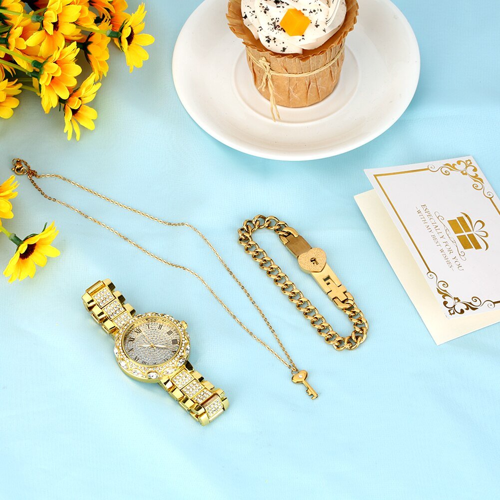 3PCS Womens Fashion Watches with Bracelet Key Necklace Set Gift for Ladies Elegant Quartz Wristwatch Gold Reloj De Mujer