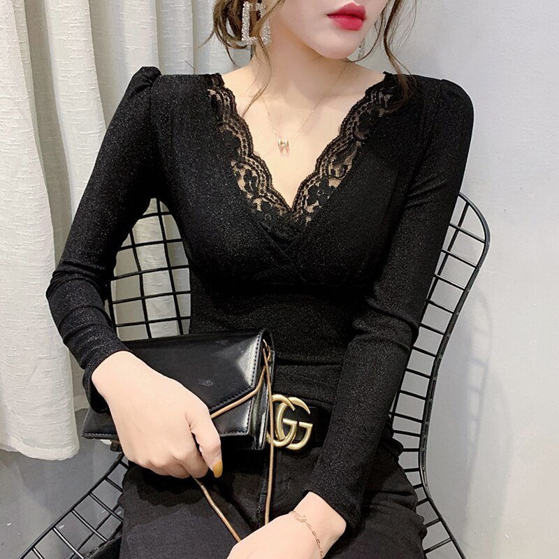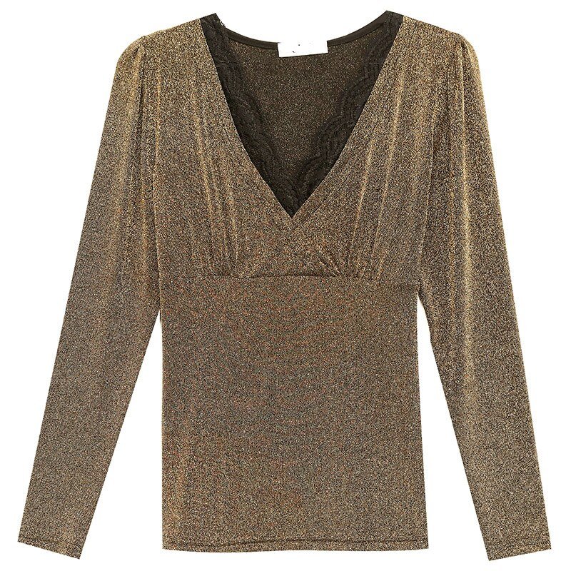 Gold Red Black Basic Shiny Mesh T Shirt Women V Neck Spliced Lace Long Sleeve T Shirt Female Woman T Shirt Spring
