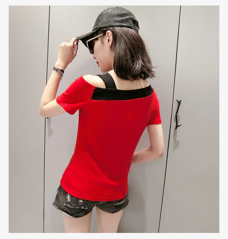 Red Black White Sexy T Shirt Women Short Sleeve Slim Off Shoulder T Shirt Female Stretch Cotton Summer Tops Skew Collar