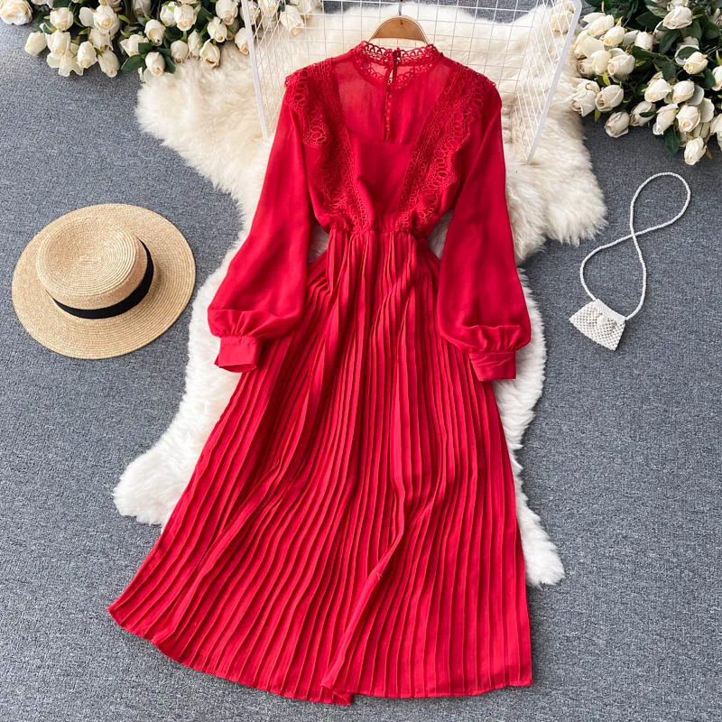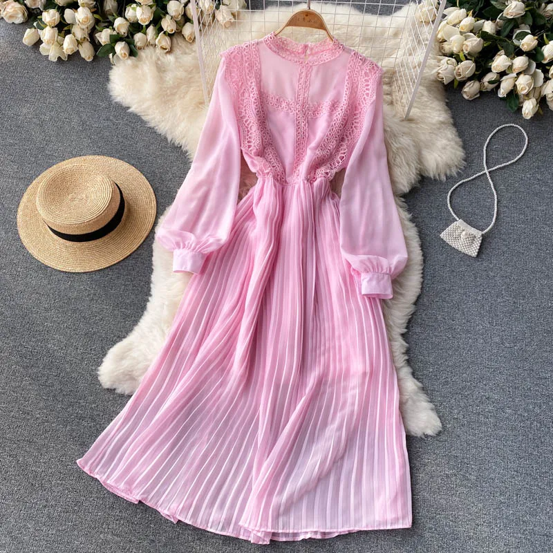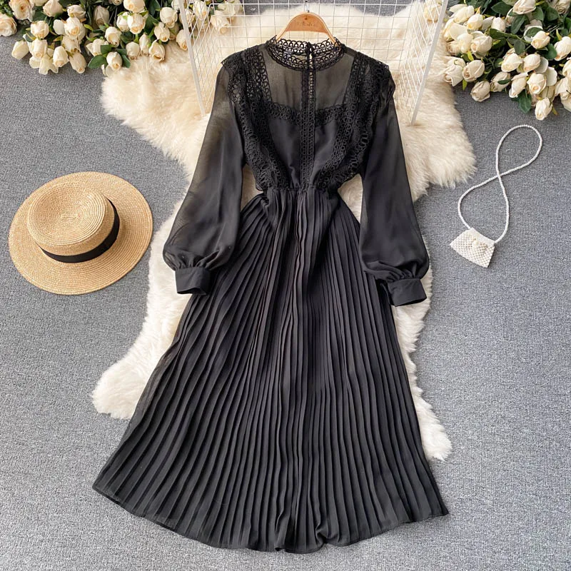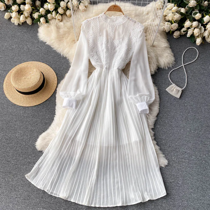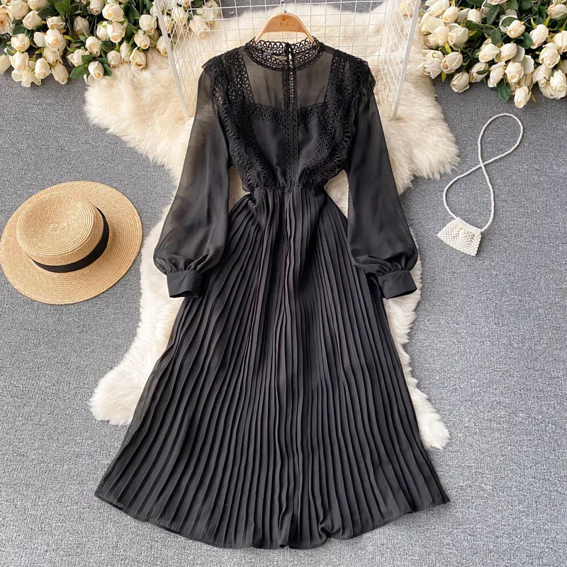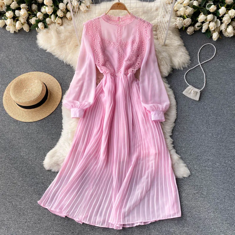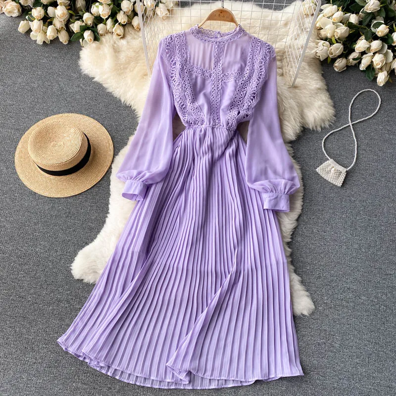Autumn Casual Solid Slim Lady Full Dress A Line O Neck Puff Sleeve Chiffon Pullover Mid-Calf Women Dresses