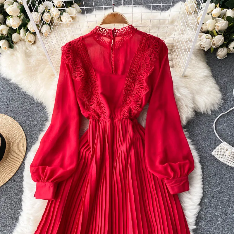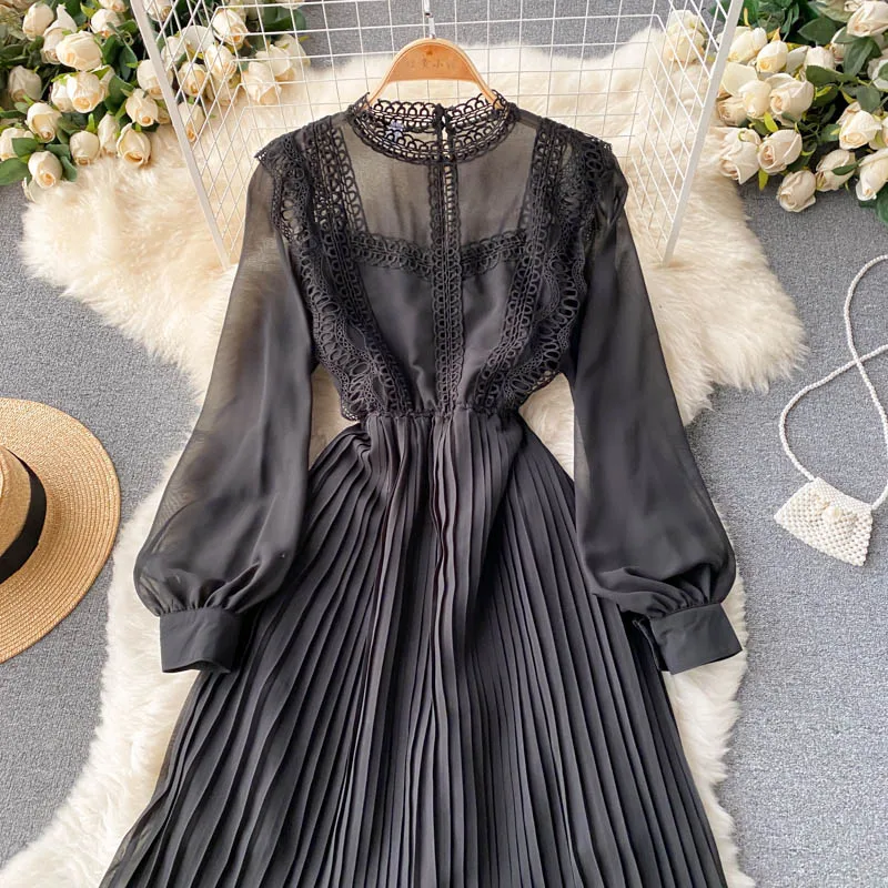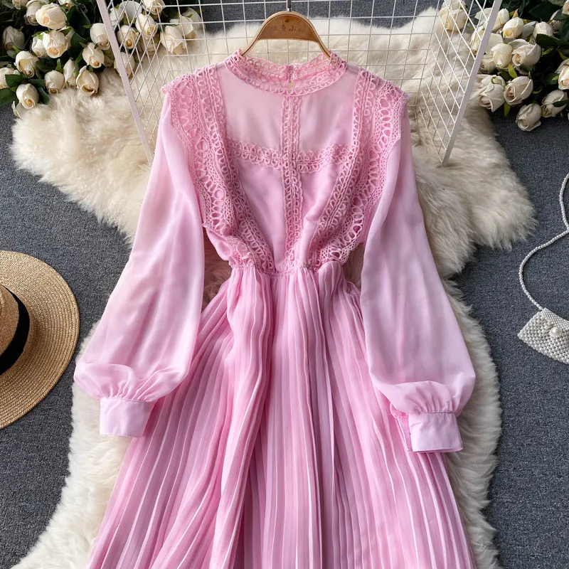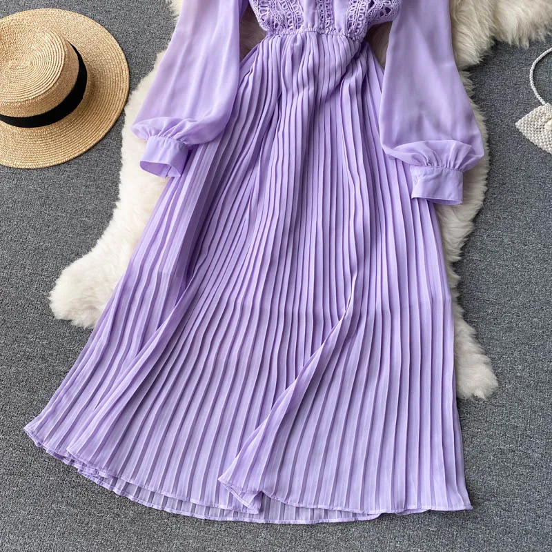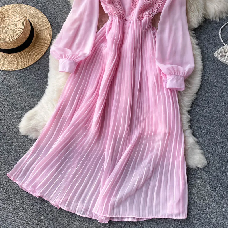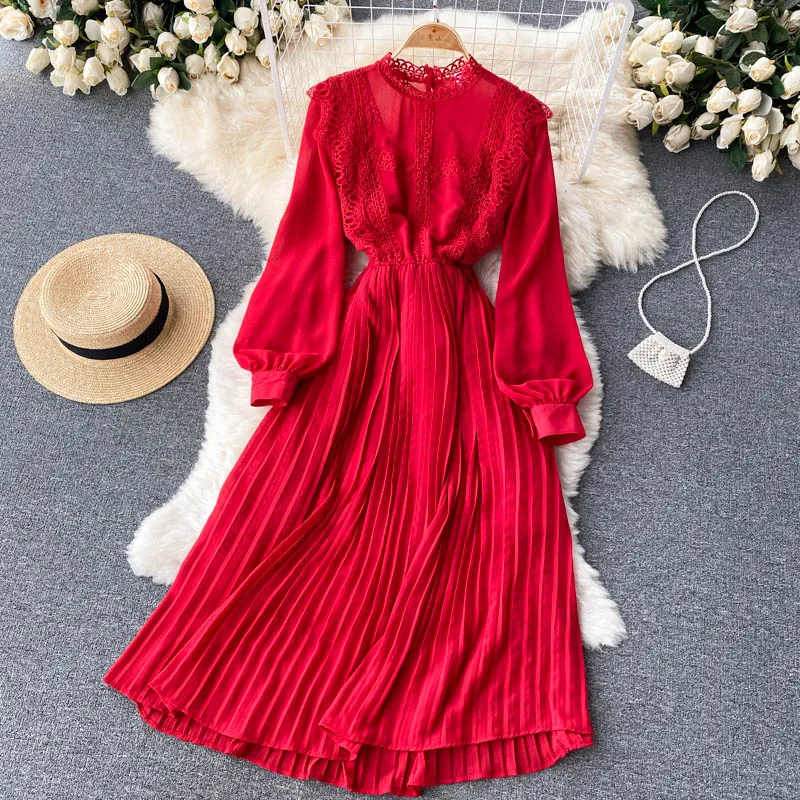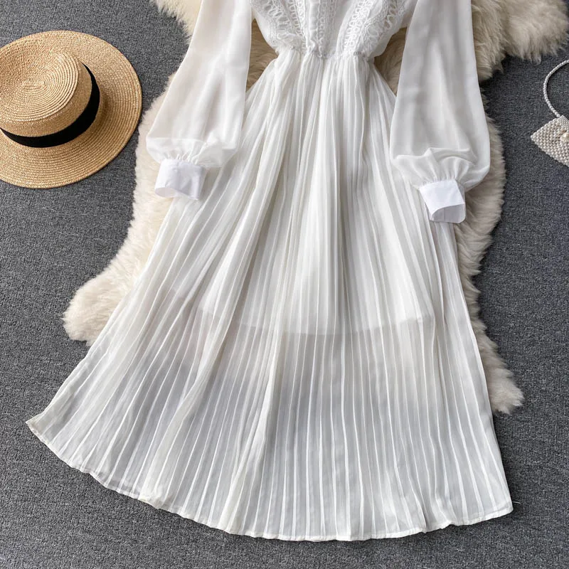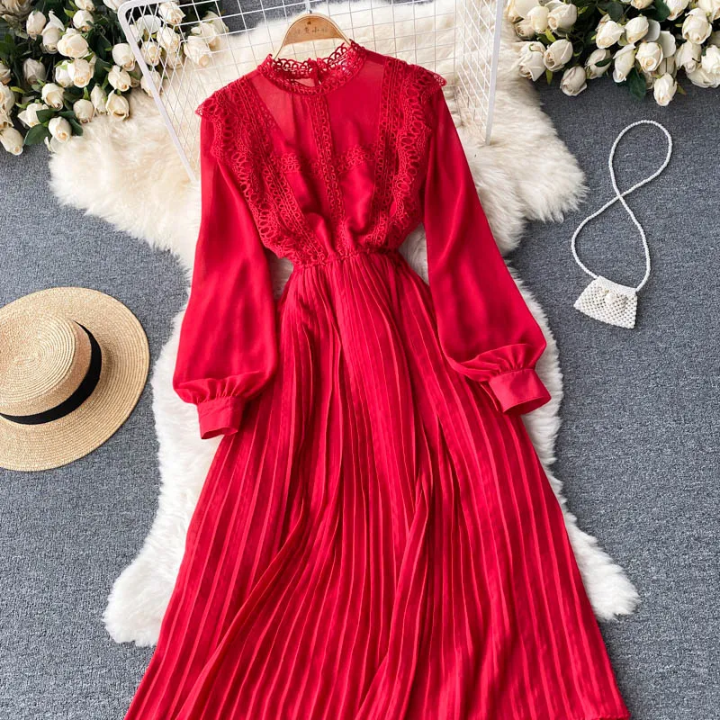 Autumn Casual Solid Slim Lady Full Dress A Line O Neck Puff Sleeve Chiffon Pullover Mid-Calf Women Dresses