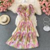 Summer Casual Short Floral Print Lady Dress A Line V Neck Sweet High Waist Mid-Calf Women Dresses