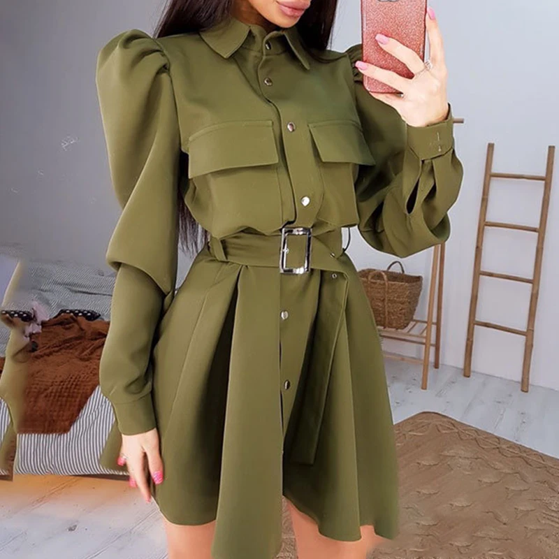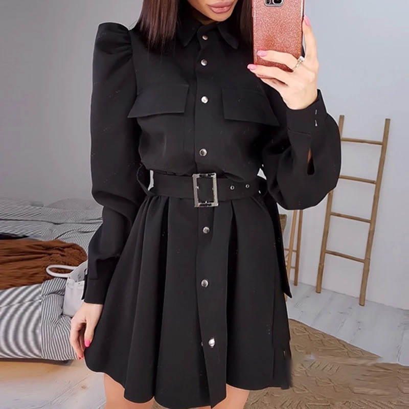 Be the first to review “Autumn Casual Solid Color Pocket Mini Dress Women’s Elegant Belt Single-Breasted Party Dress Stylish New Lapel Puff Sleeve Dress”