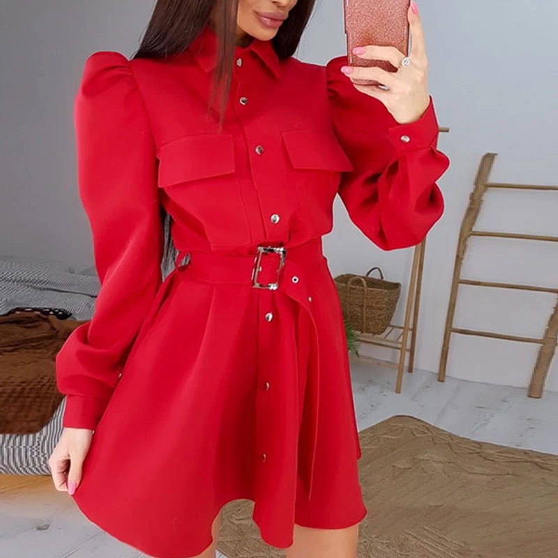 Autumn Casual Solid Color Pocket Mini Dress Women’s Elegant Belt Single-Breasted Party Dress Stylish New Lapel Puff Sleeve Dress