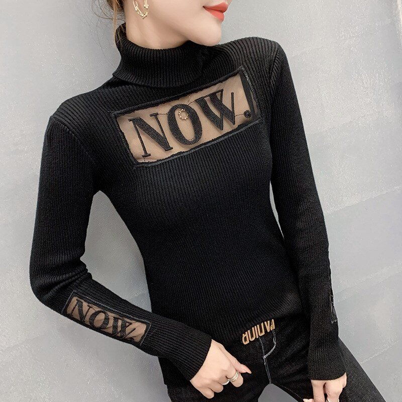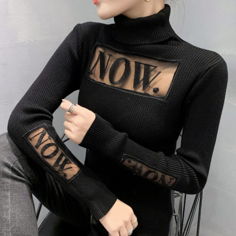 Autumn/Winter Women’s Aesthetic Sweater Hollow Embroidery High Neck Long Sleeve Bottoming Fashion Sweater Slim Fit Pullover Top