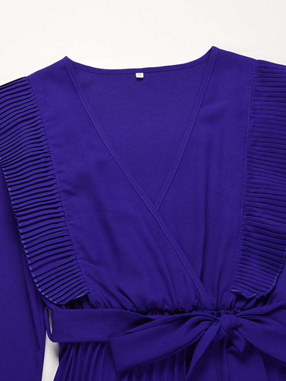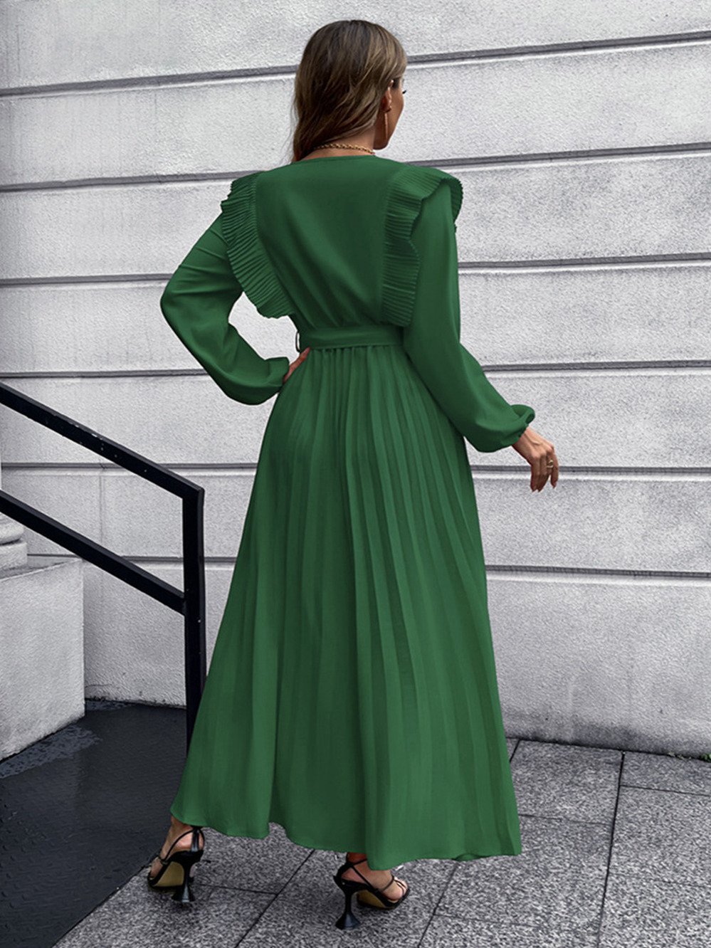 Autumn Winter Women’s Temperament V Neck Large Swing Pleated Dress For Laides Fashin Solid Color Lace Up Long Dresses
