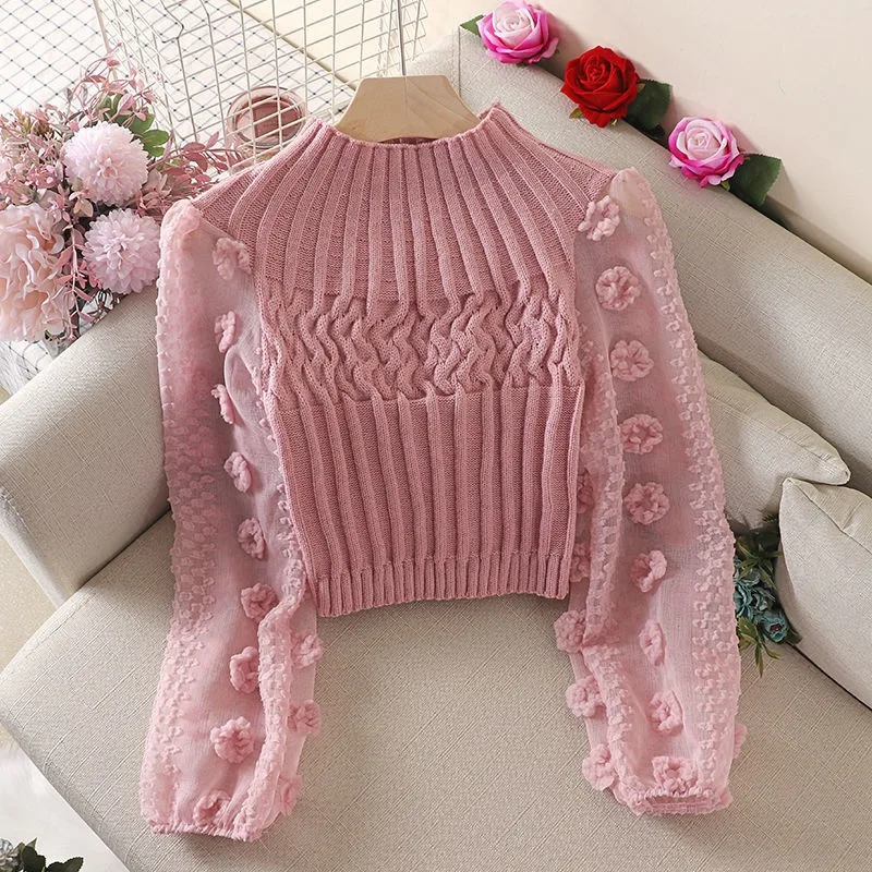 Features: super fairy, puff sleeves, net yarn, stitching, round neck, tight-fitting, slimming, short, sweater knitwear
