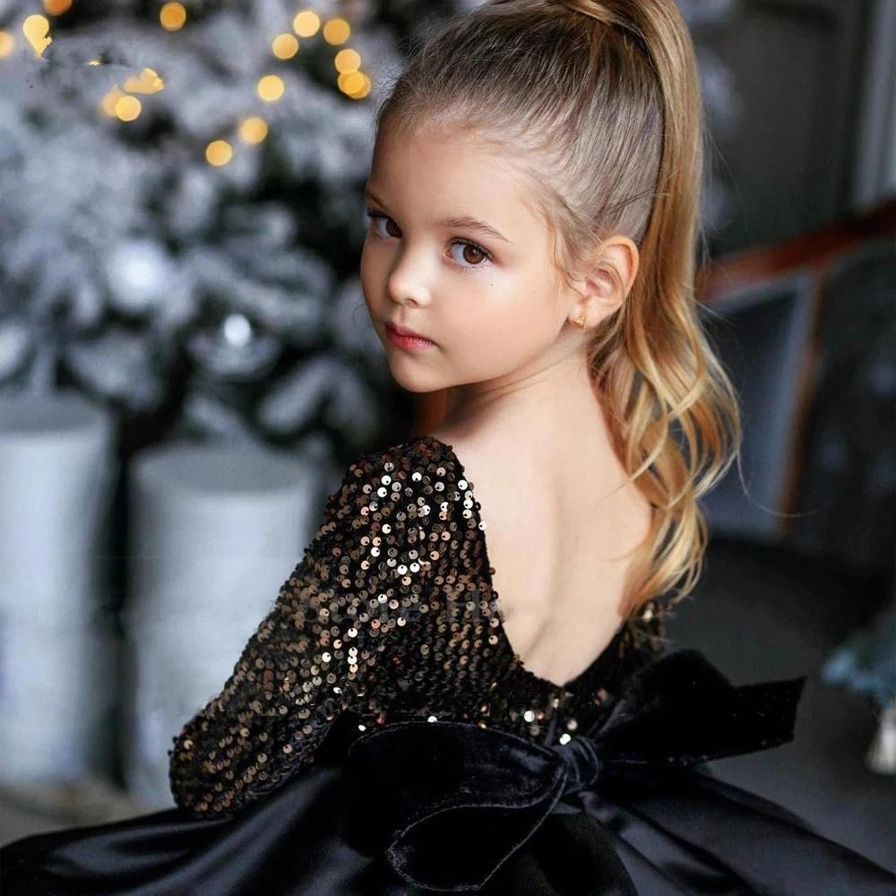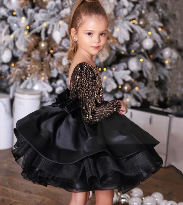 Black Baby Girl Birthday Dress Sequined Fluffy Flower Girl Dresses For Weddings Kids Princess Ball Gown Lush Dresses For Girls
