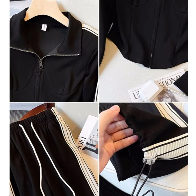 Casual Fashion Set Women’s Spring and Autumn High End Flip Collar Coat Age Reducing Sports Wide Leg Pants Two Piece Setpant sets