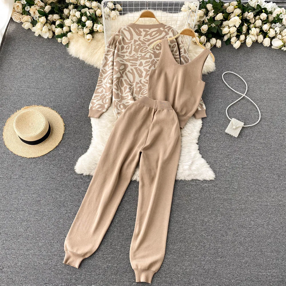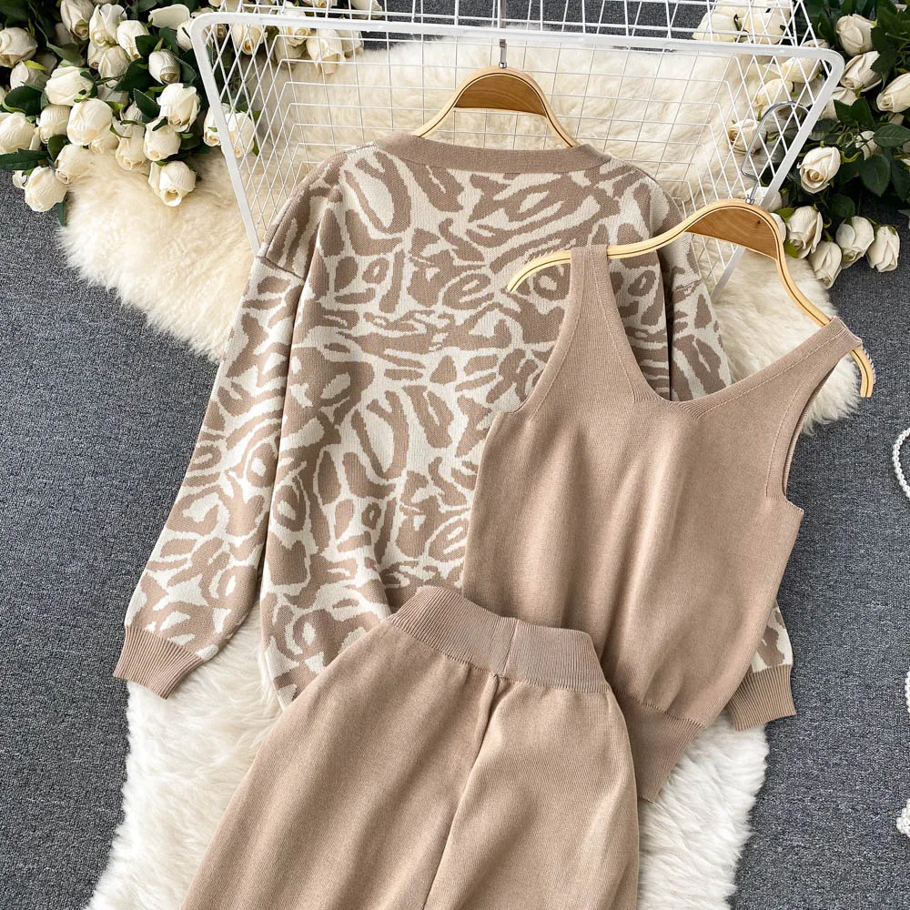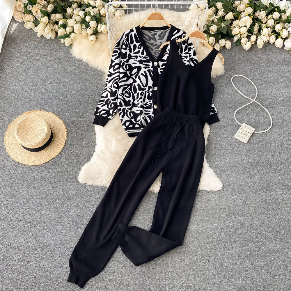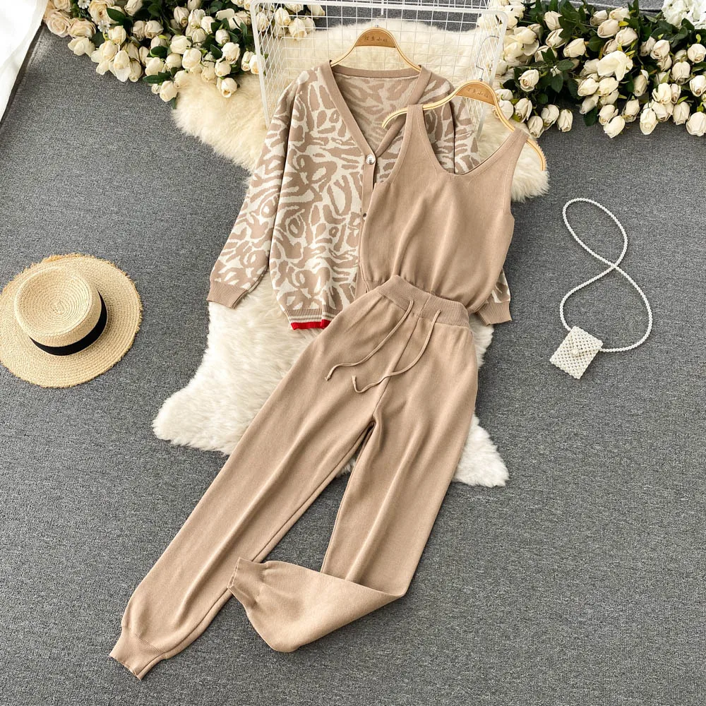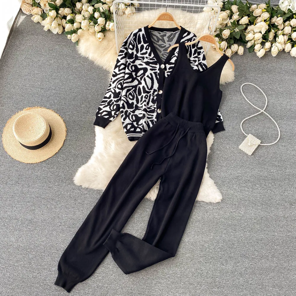 Casual Knitted Suit Women Loose All-match Cardigan Jacket Slim-fitting Vest With High Waist Trousers Fashion Three-piece Suit