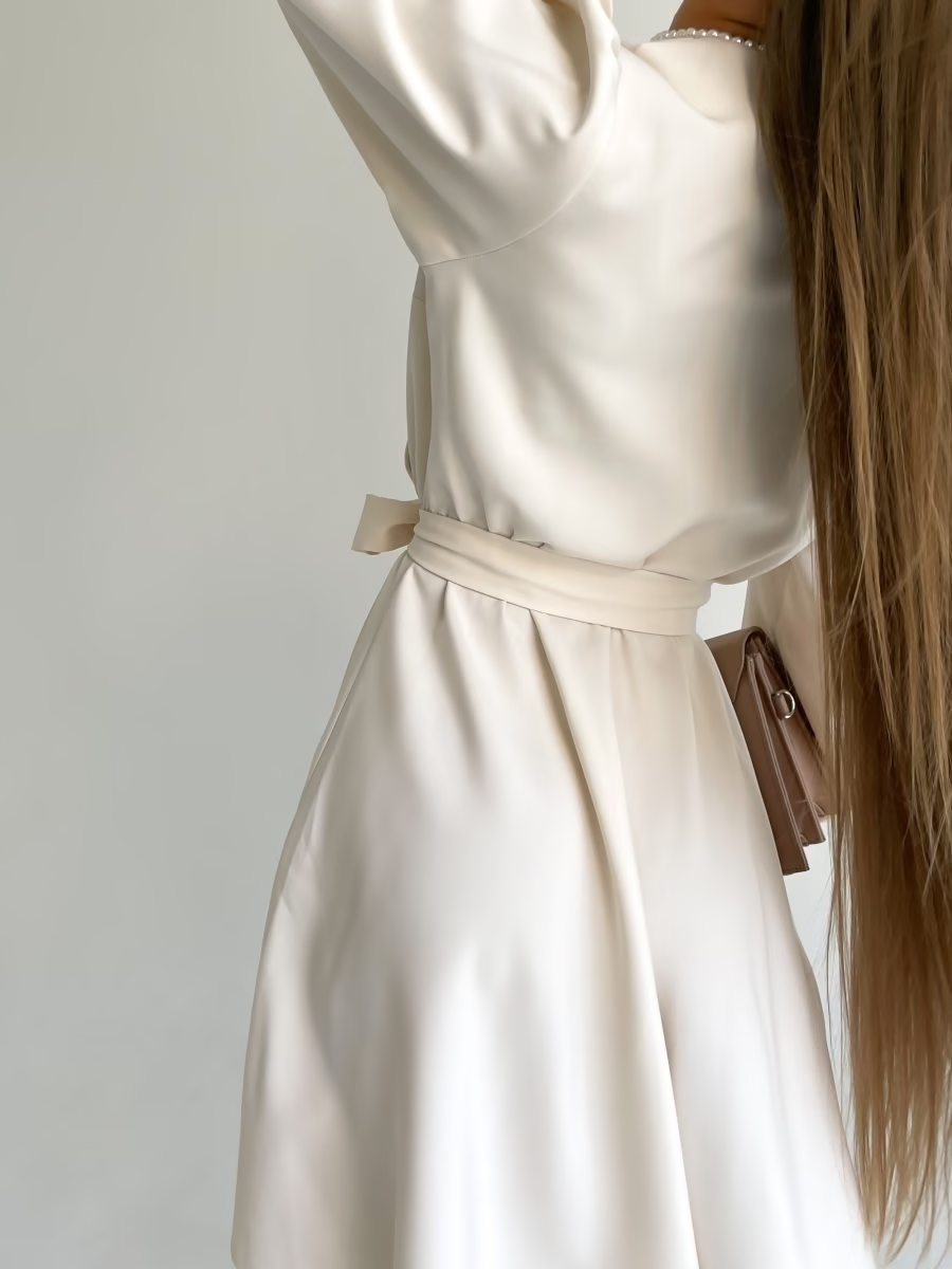 Be the first to review “Casual V Neck Sashes Beige A Line Dress Fashion Lantern Sleeve High Waist Loose Comfort Office Lady Dresses”