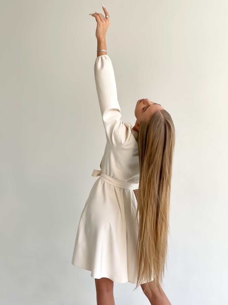 Casual V Neck Sashes Beige A Line Dress Fashion Lantern Sleeve High Waist Loose Comfort Office Lady Dresses