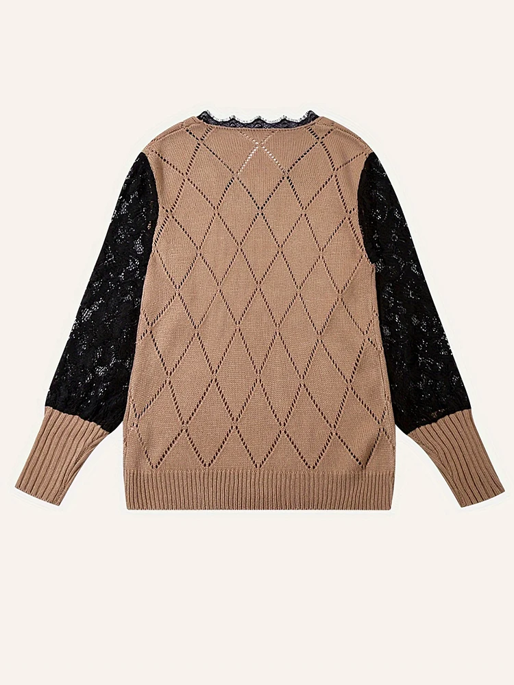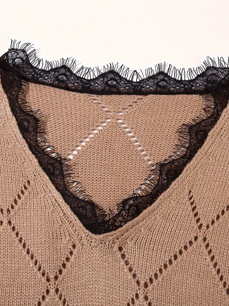 Contrast Lace V Neck Pointelle Knit Sweater, Casual Long Sleeve Sweater For Spring & Fall