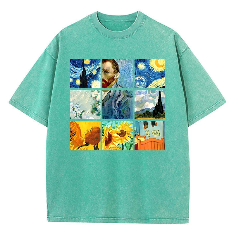 Cotton Woman Washed T-Shirts Van Gogh’S Starry Night And Sunflowers Prints Tops Distressed Oversized Tees Casual Female Clothes
