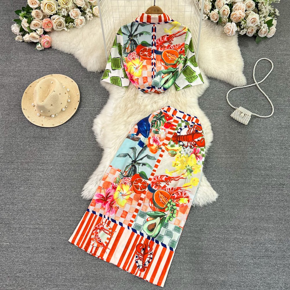 Designer Fashion Runway Skirt Suit Summer Women’s Lapel Fruit Print Shirts High Waist Pencil Skirt 2 Piece Set Outfits