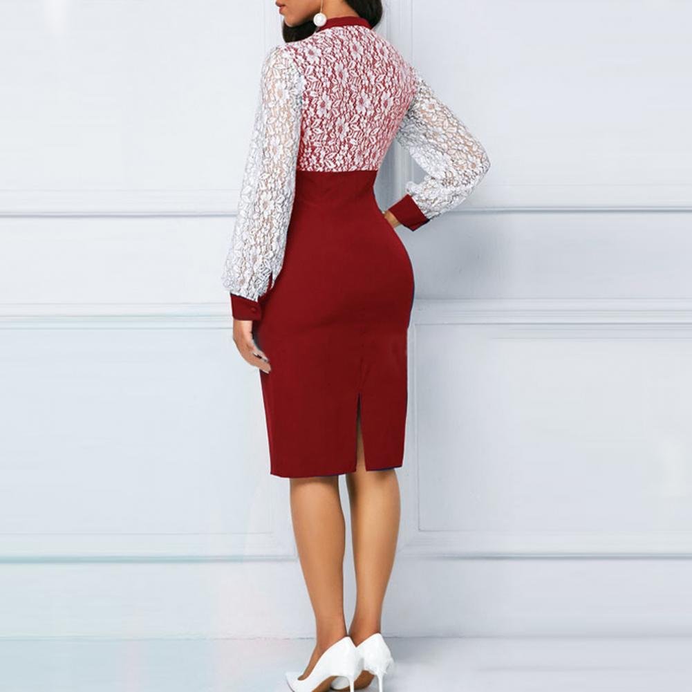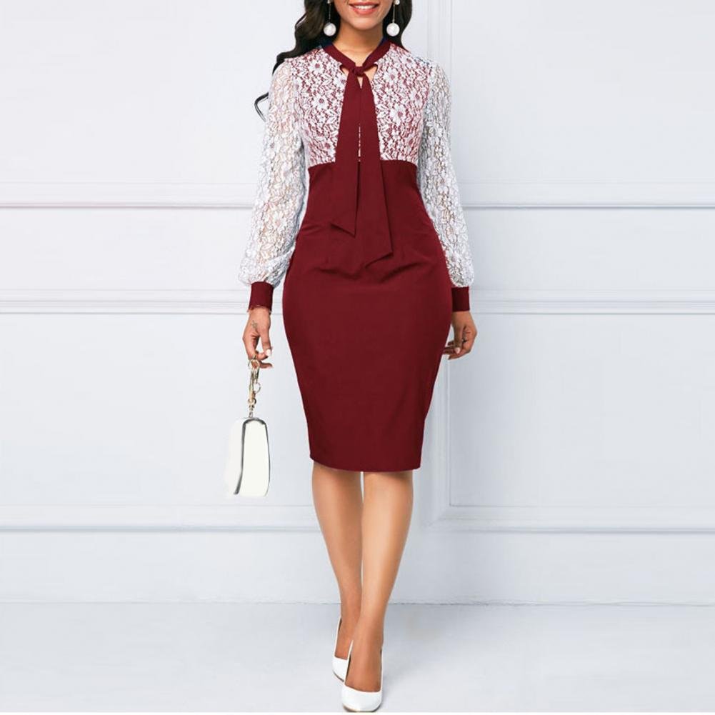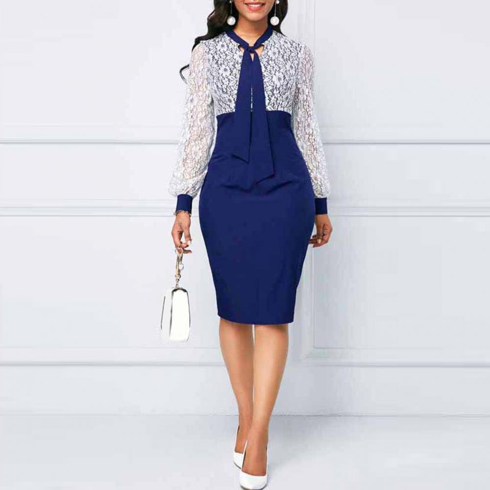 Dress Stylish Long Sleeve Lace-up Pencil Dress Spring Autumn Midi Dress Lace Patchwork for Prom