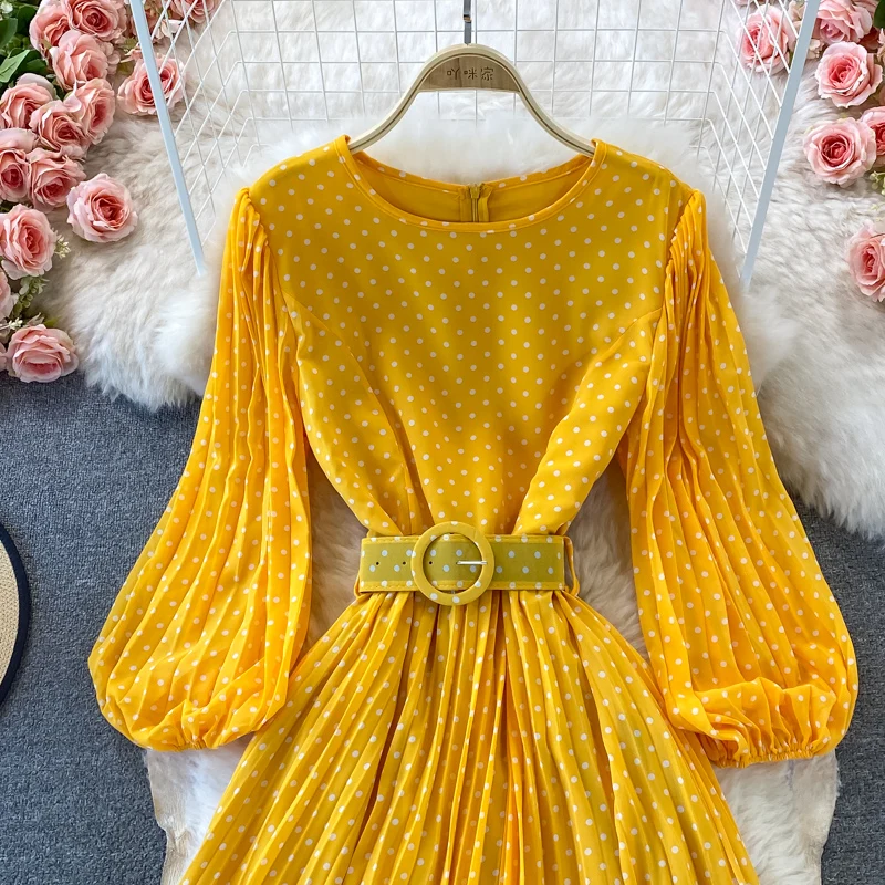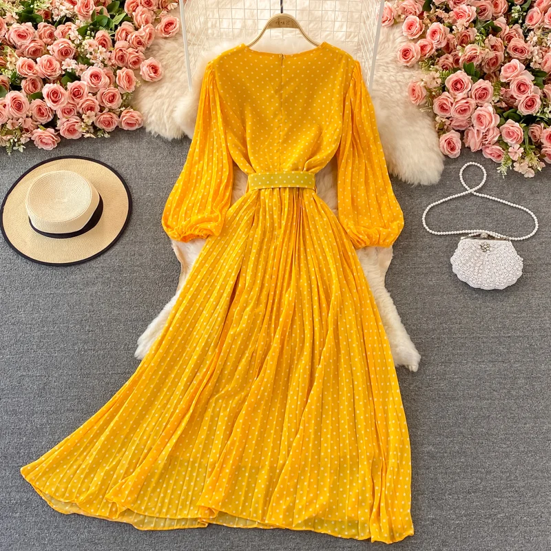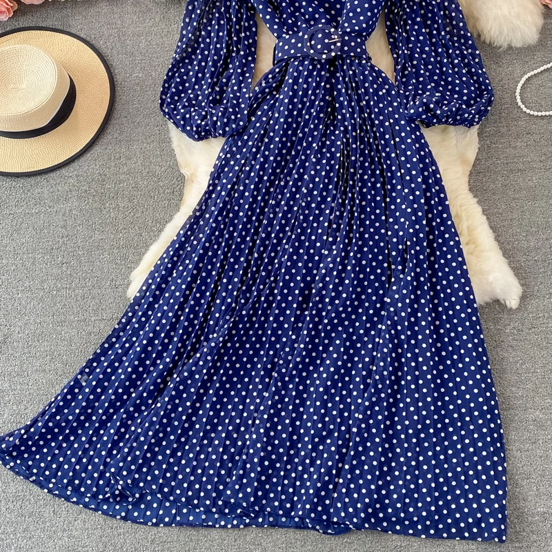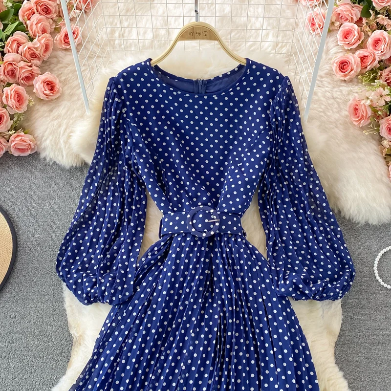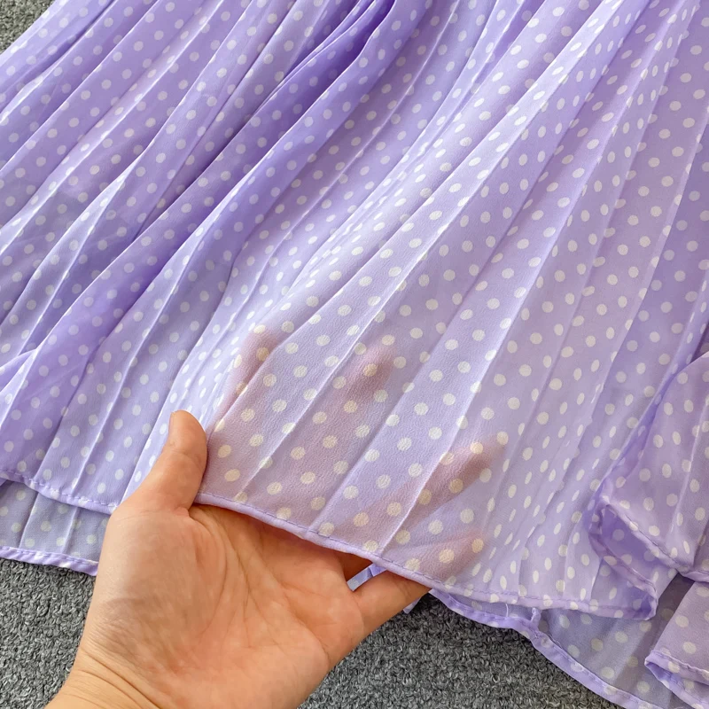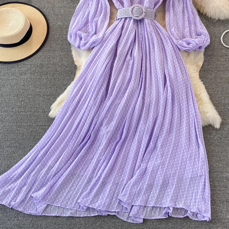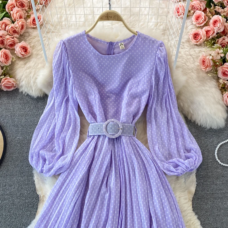 Elegant Women’s Purple Polka Dot Pleated Dress O-neck Lantern Sleeve Chiffon Mixi Dress Female Vestidos
