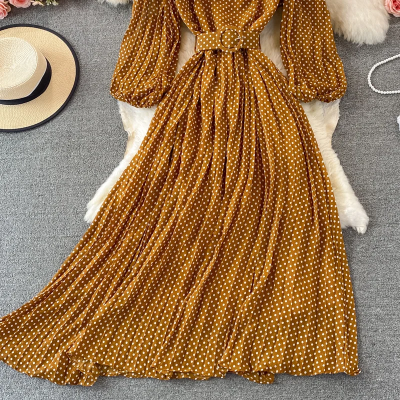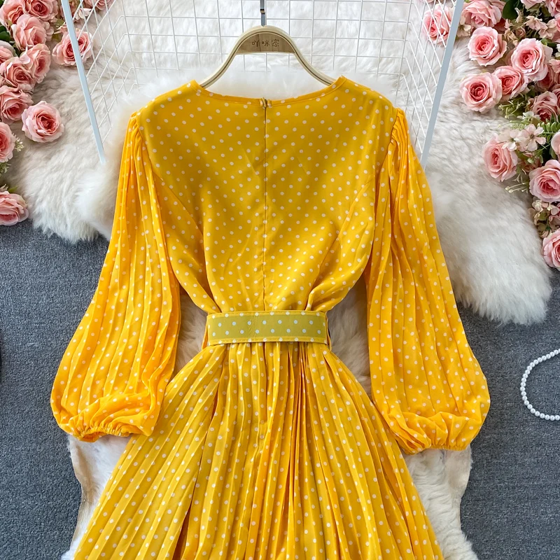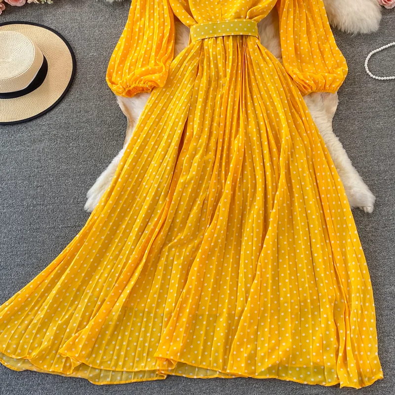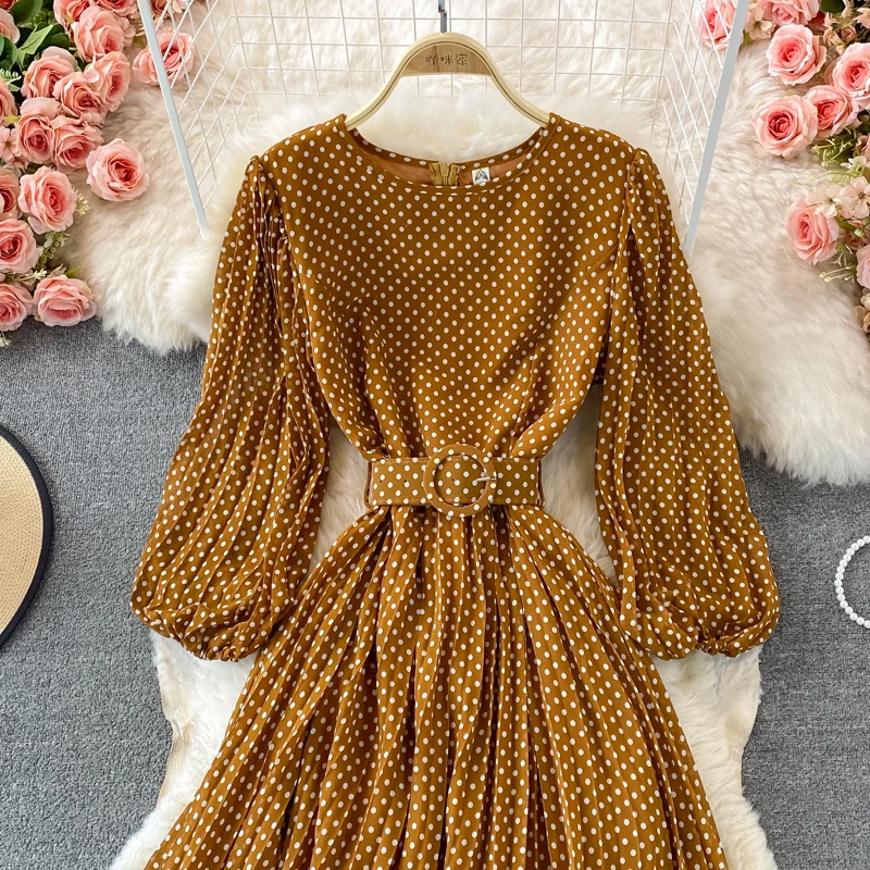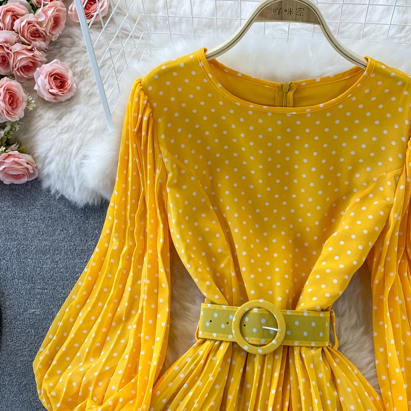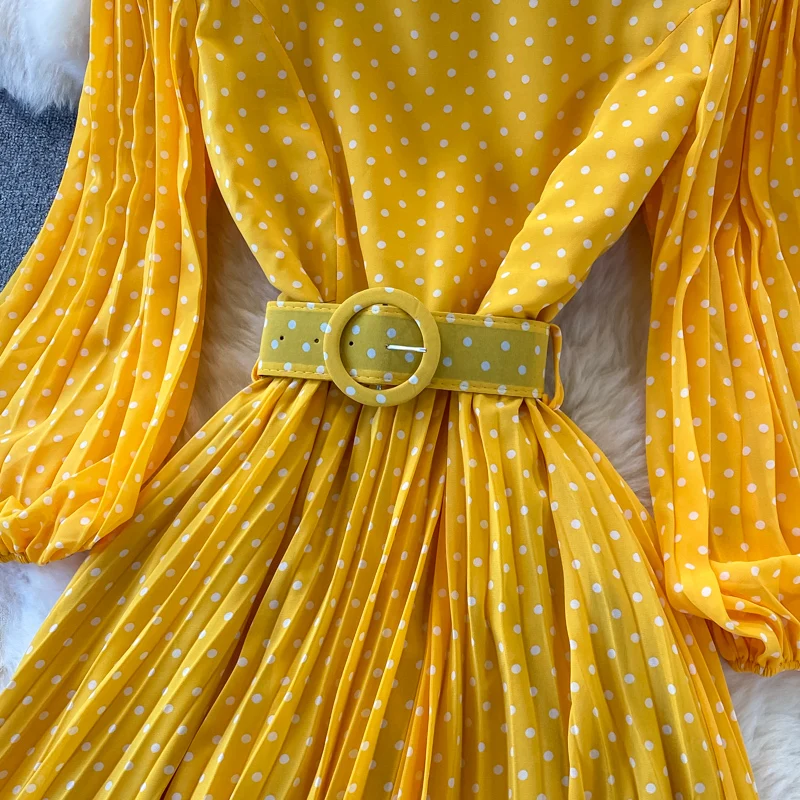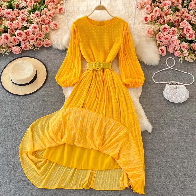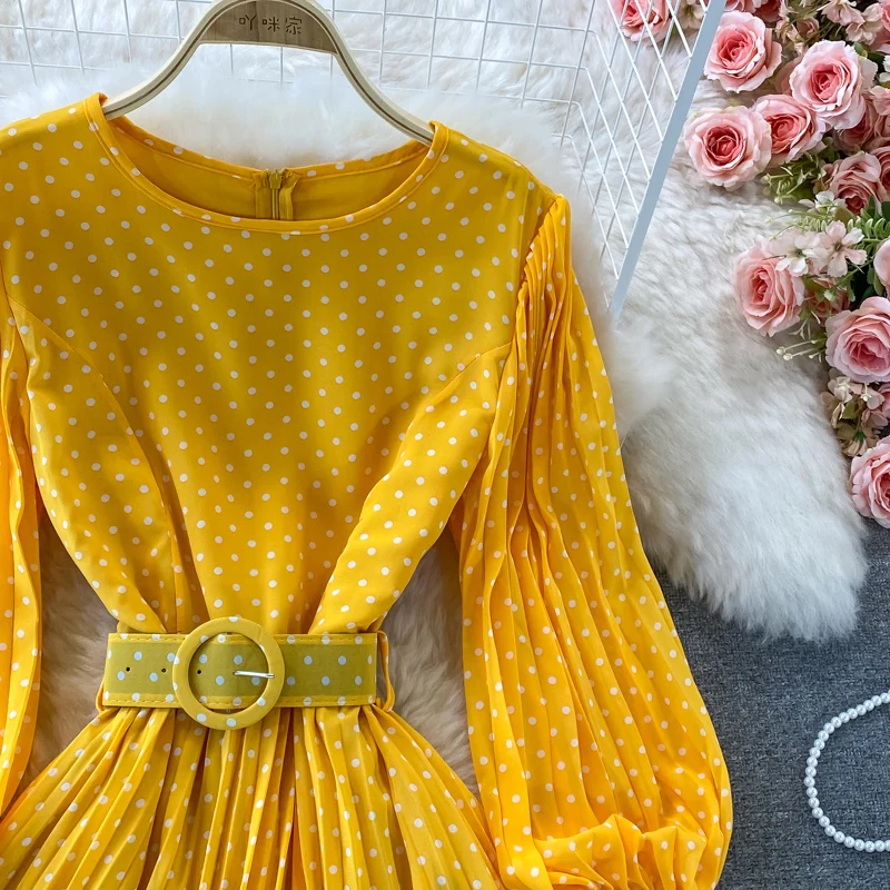 Elegant Women’s Purple Polka Dot Pleated Dress O-neck Lantern Sleeve Chiffon Mixi Dress Female Vestidos