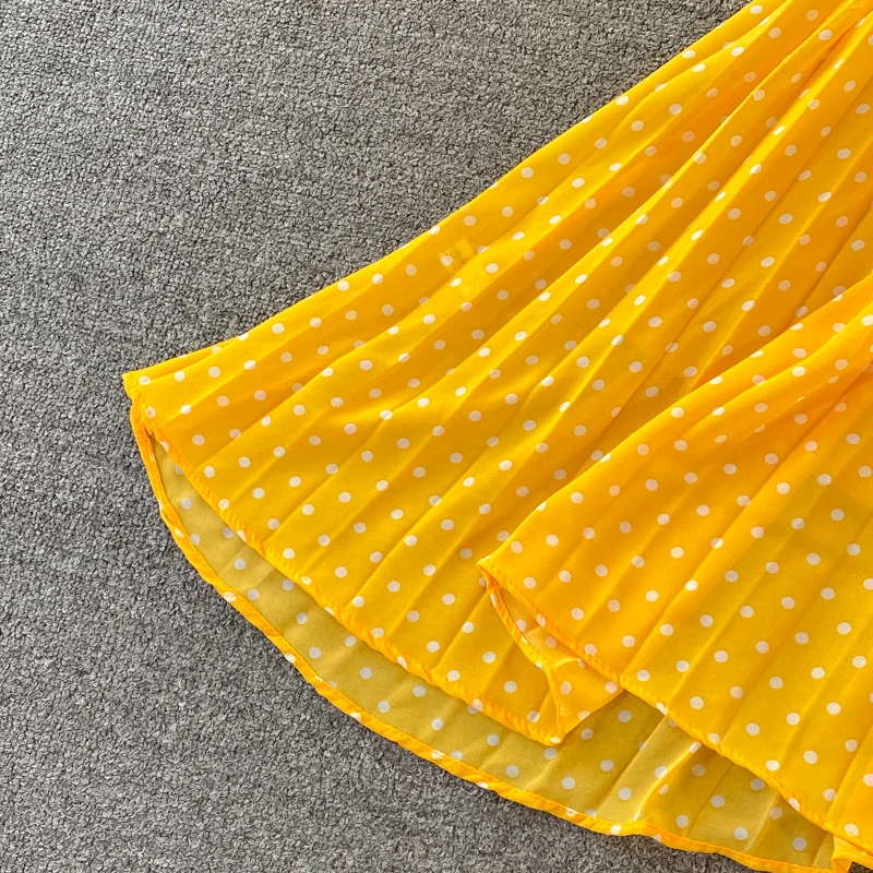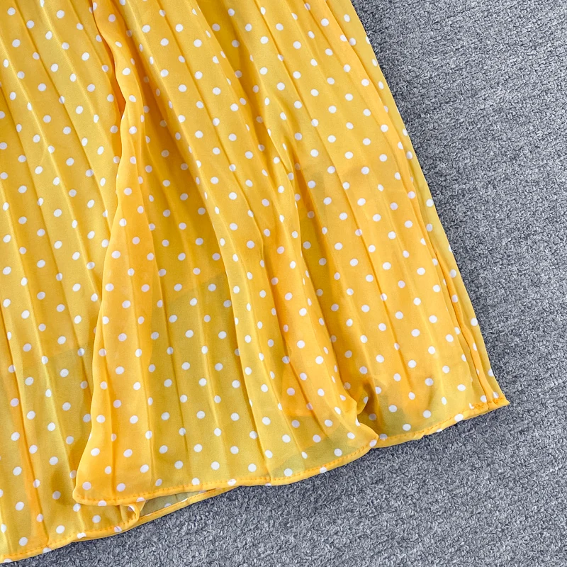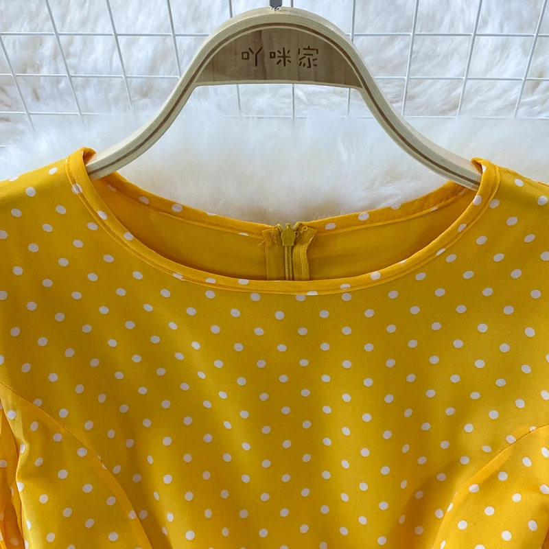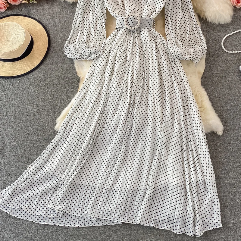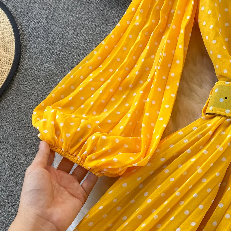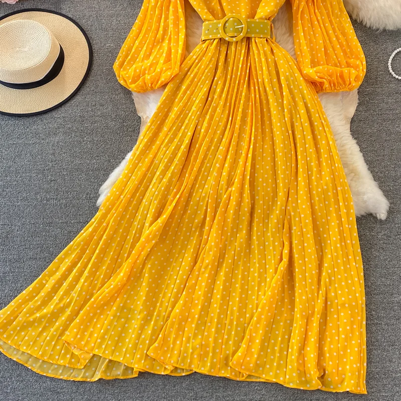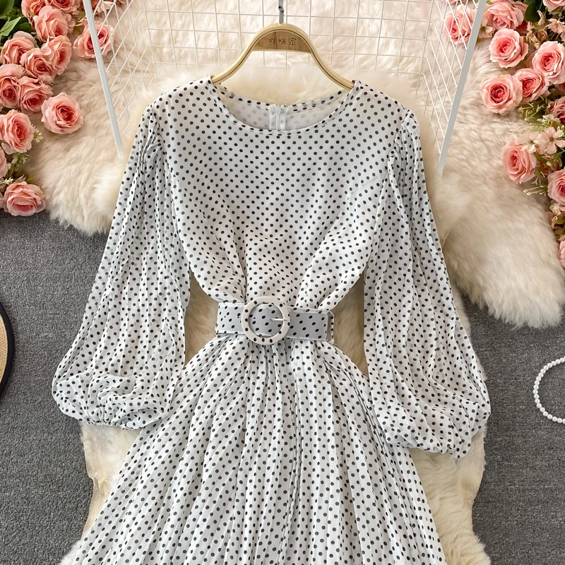 Elegant Women’s Purple Polka Dot Pleated Dress O-neck Lantern Sleeve Chiffon Mixi Dress Female Vestidos
