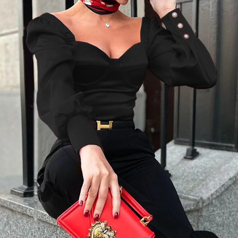 Be the first to review “Fashion Black Red Sexy One Shoulder Short Long Sleeved Satin Top Elegant Women’s Spring Autumn Bubble Sleeves Street Style Shirt”