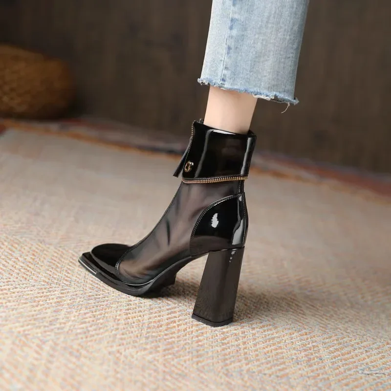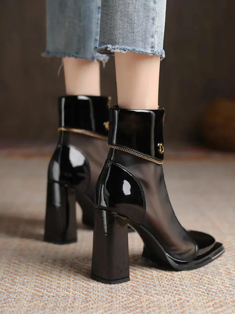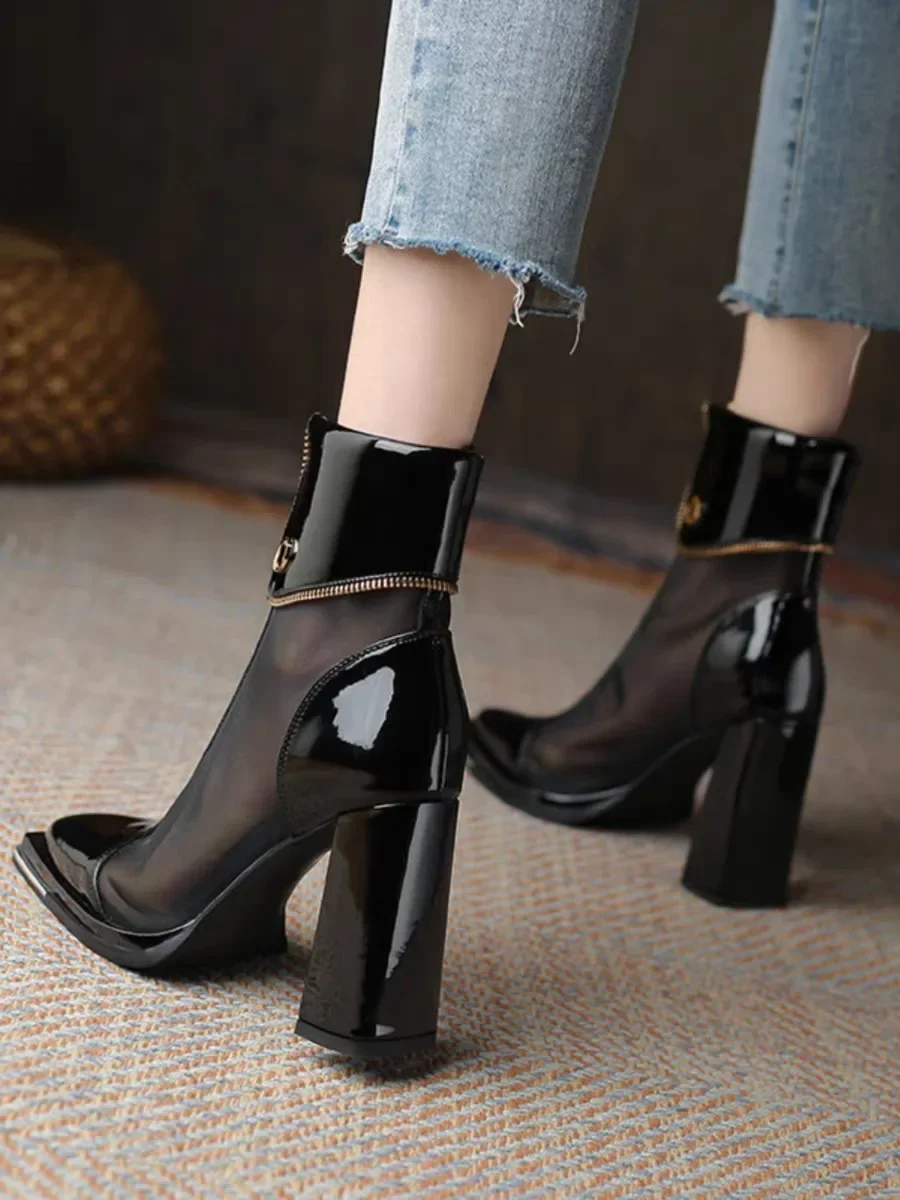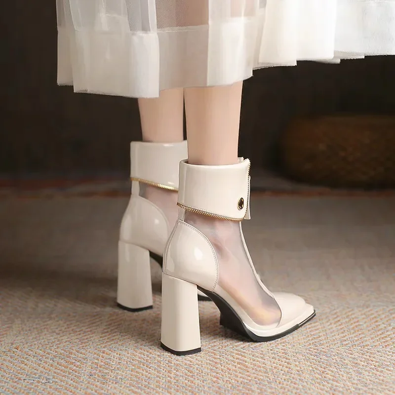 Fashion Chunky High Heels Spring Mesh Solid Color Cool Boots Outwear Square Toe Sexy Pumps Female Short Boots