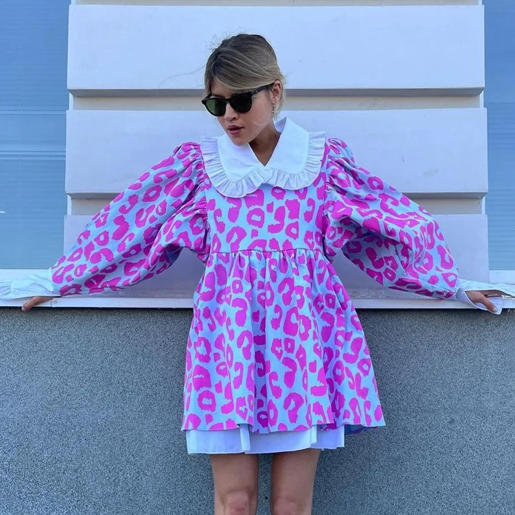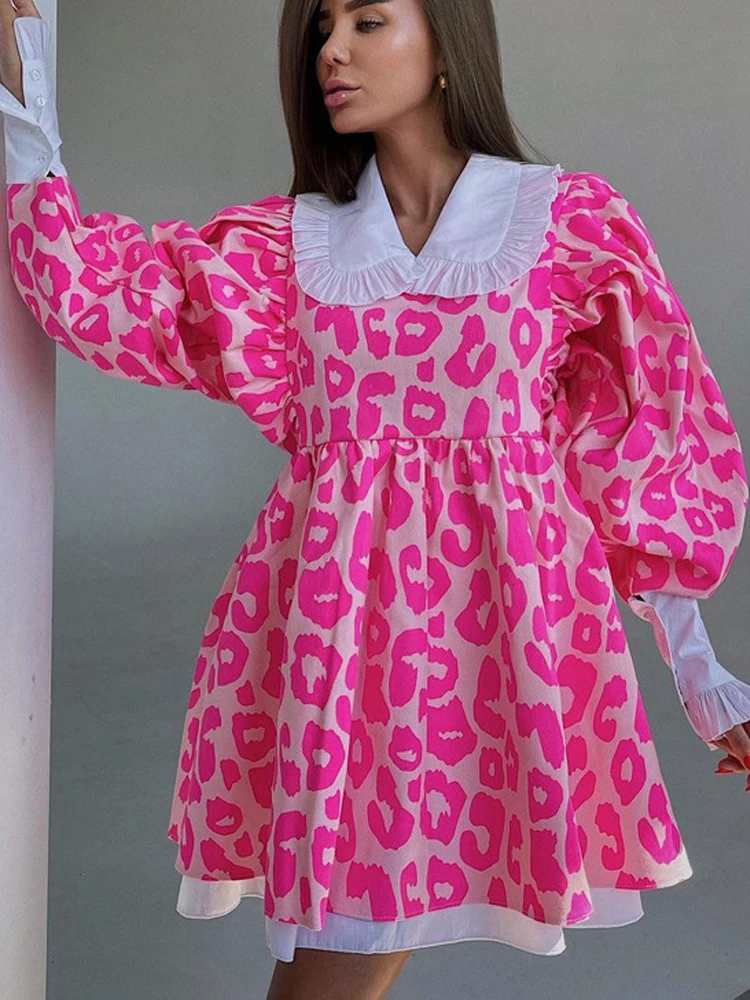 Fashion Pink Lovely Lantern Sleeve Dresses Leopard Print Long Sleeve A line Dress Casual Doll Collar Dresses Women