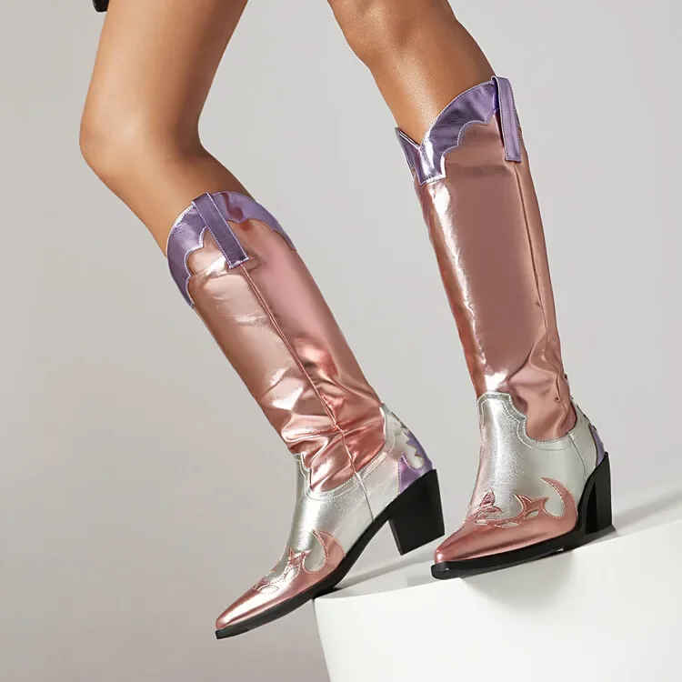 Fashion Pointed Toe Western Boots for Women Autumn Winter Pu Leather Cowgirl Boots Woman High Thick Heels Botas Big Size 46