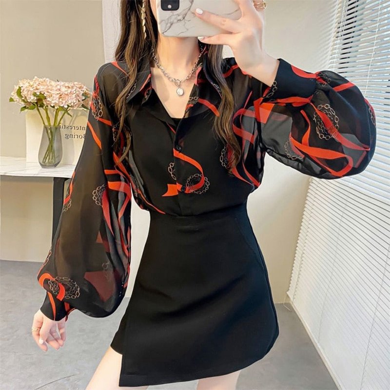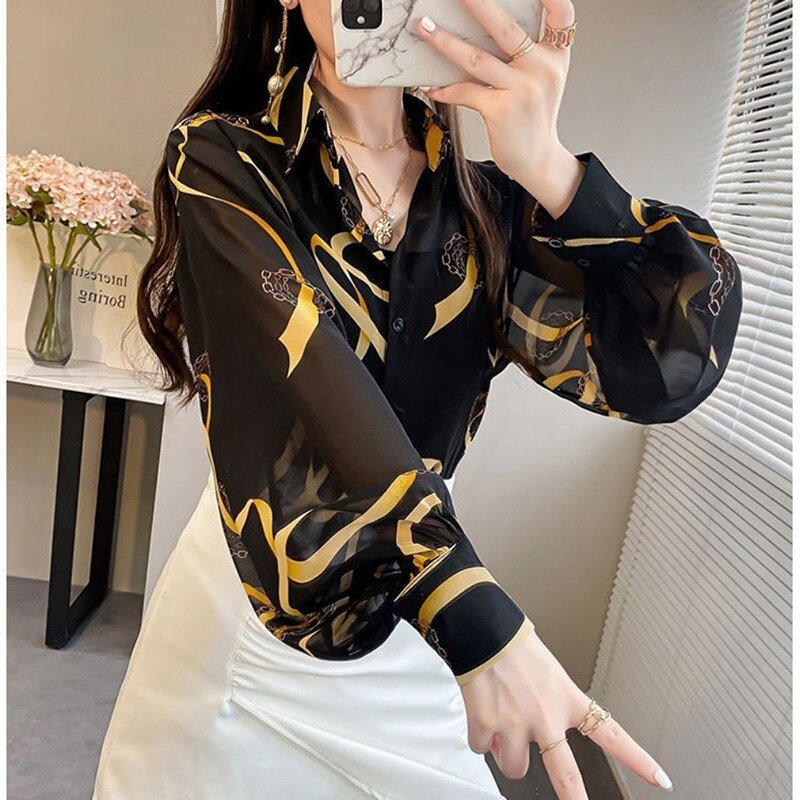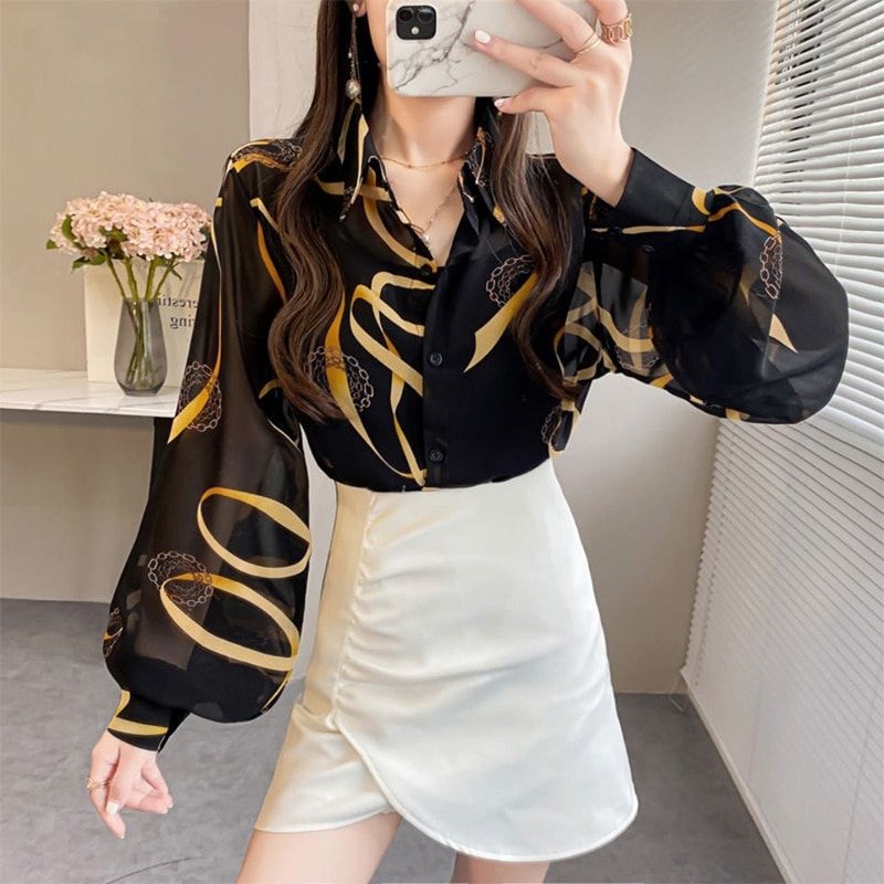 Fashion Printed Loose Chiffon Blouse Woman Clothing Summer New Button Lapel Lantern Long Sleeve Commute Casual Shirt Female