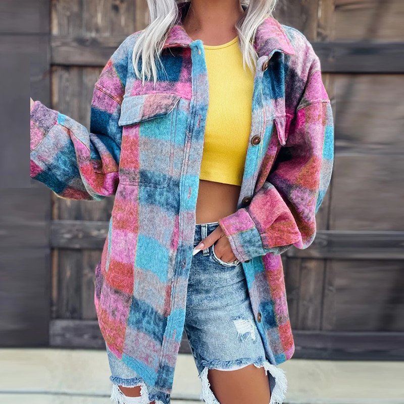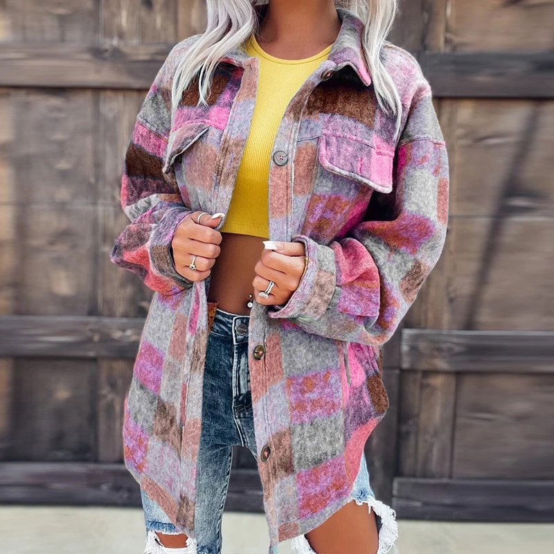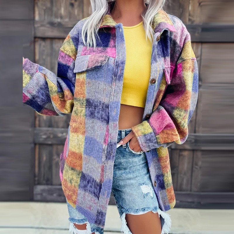 Fashion Single breasted Short Wool Coats Elegant Lapel Long Sleeve Flip Cover Shirt Jacket Autumn Women Color Block Print Jacket