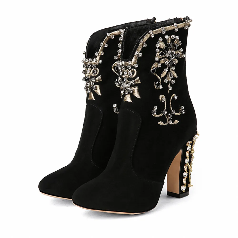 Fashion Women Kid Suede Ankle Boots Zipper Round Toe Crystal Square Heels Spring/Autumn Party Shoes Plus Size 34-43