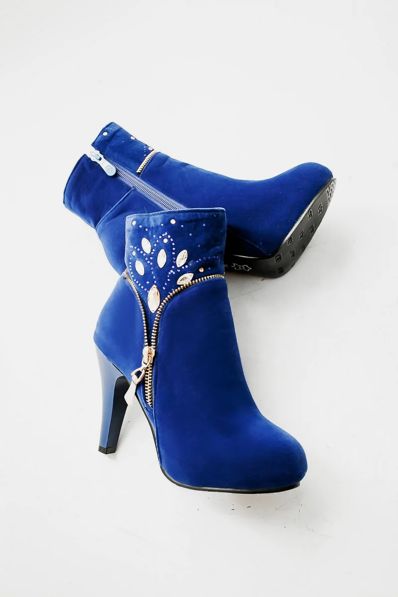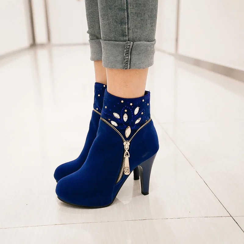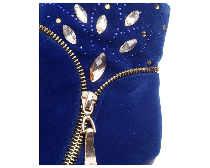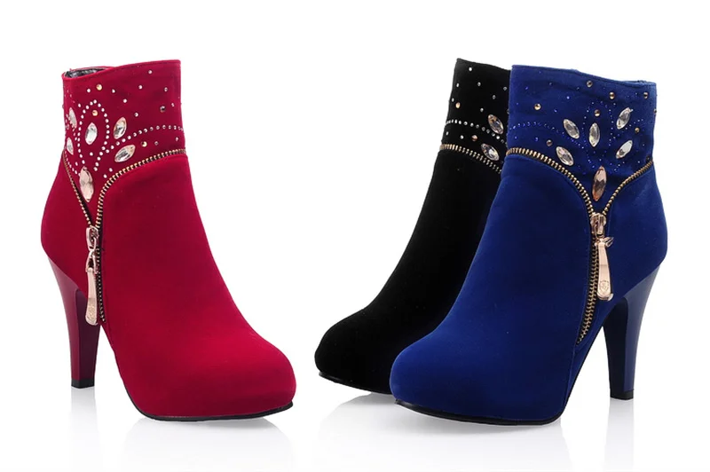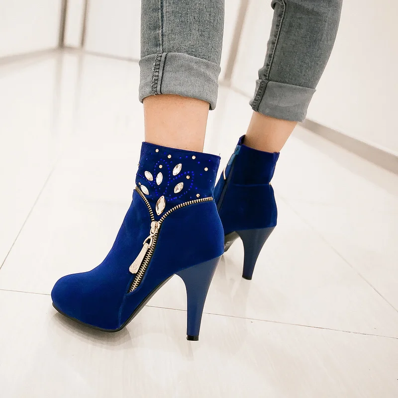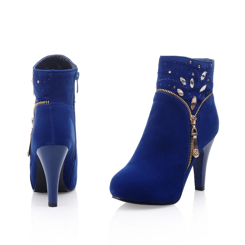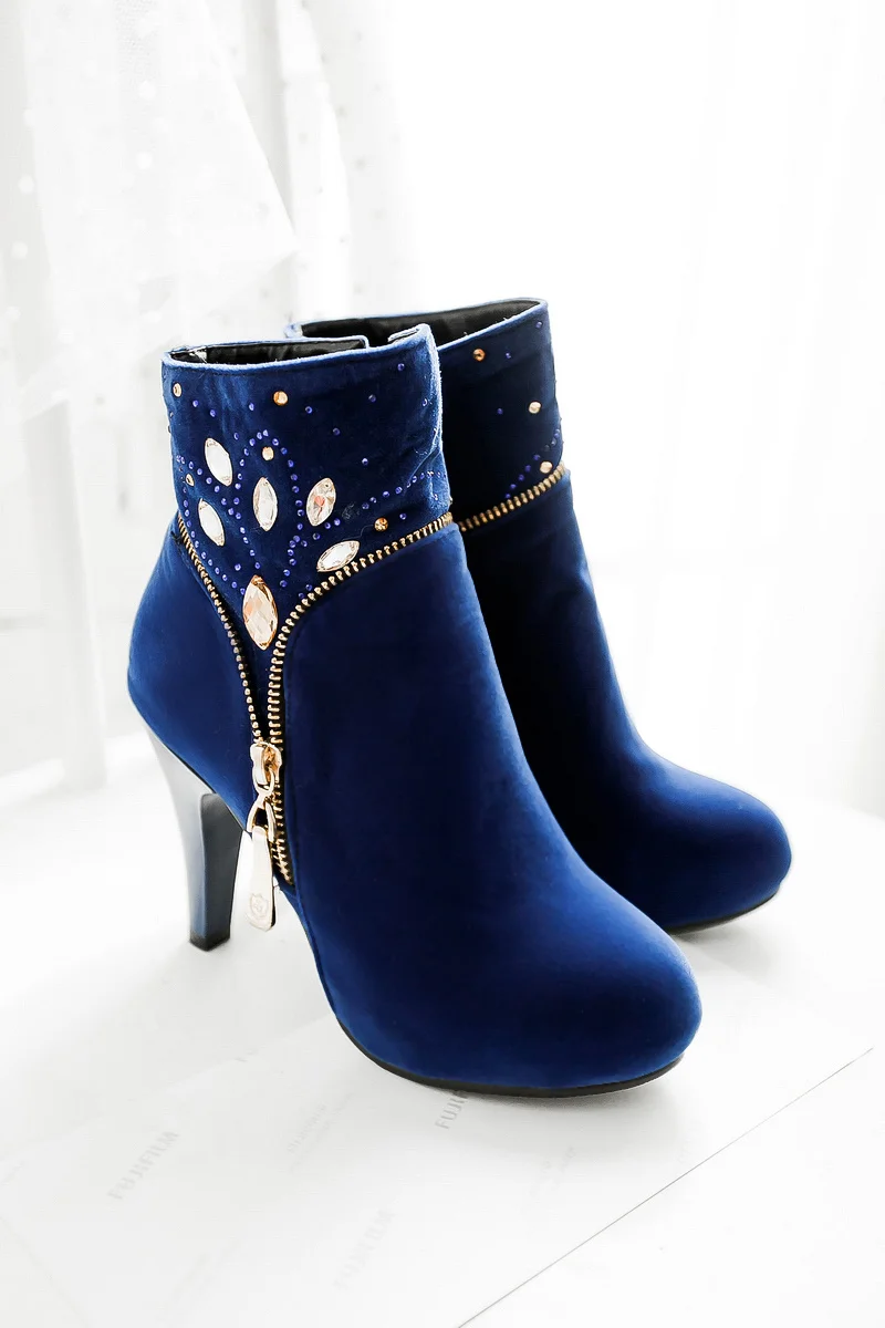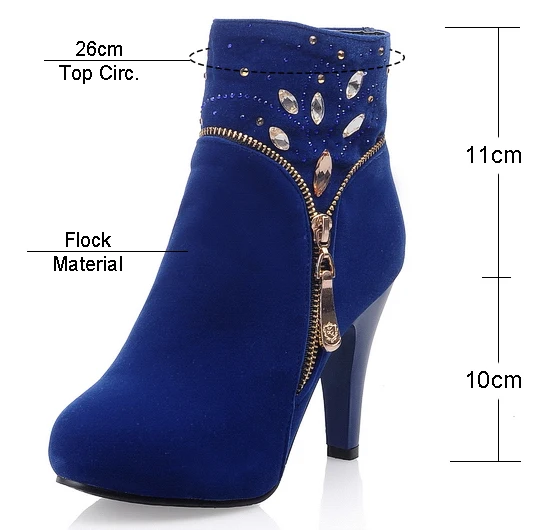Fashion Women Stiletto Ankle Boots Blue Red Black Flock Rhinestone High Chunky Heels Party Dress Lady Winter Zipper Short Boots
