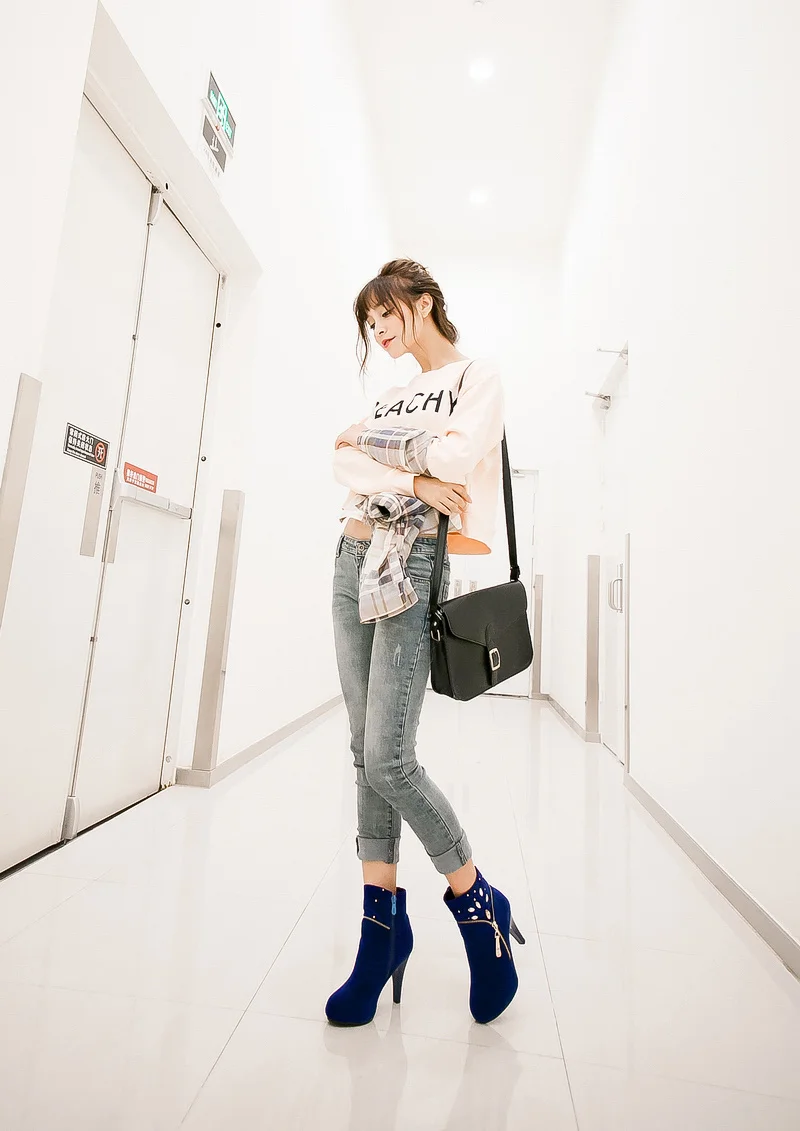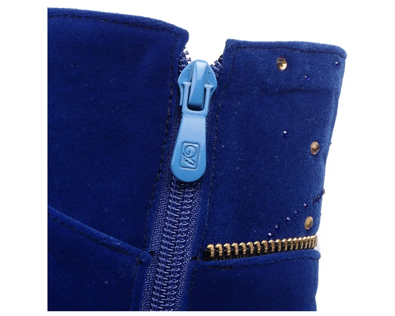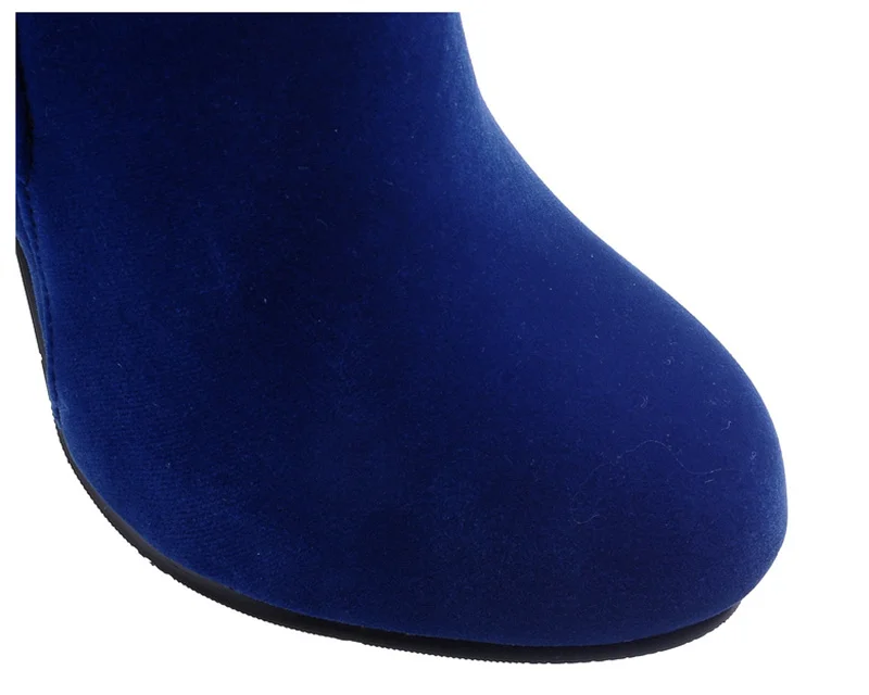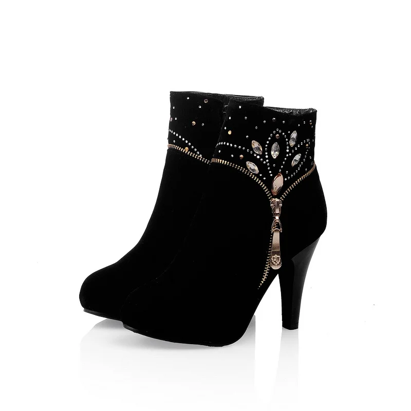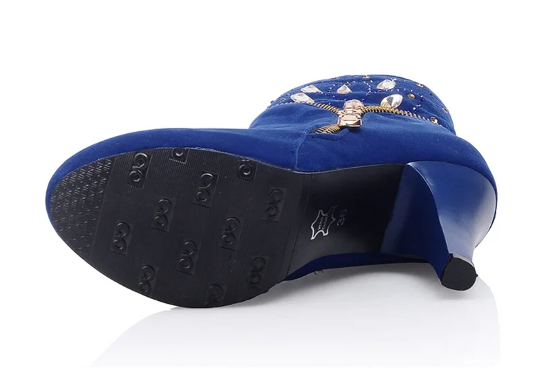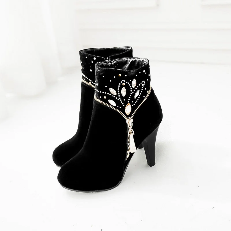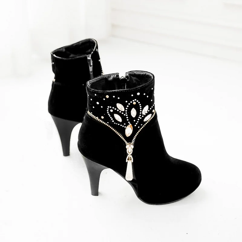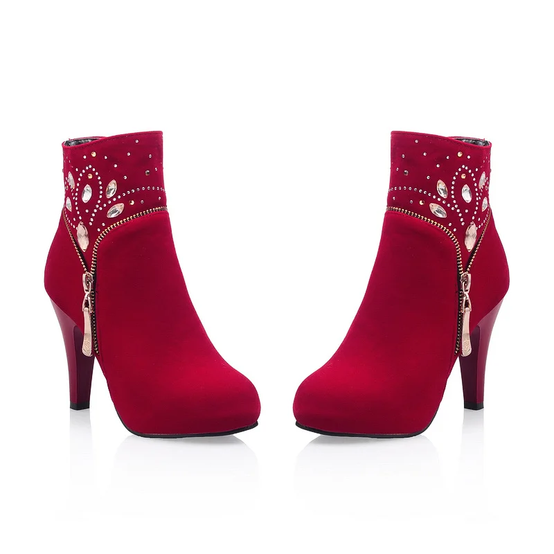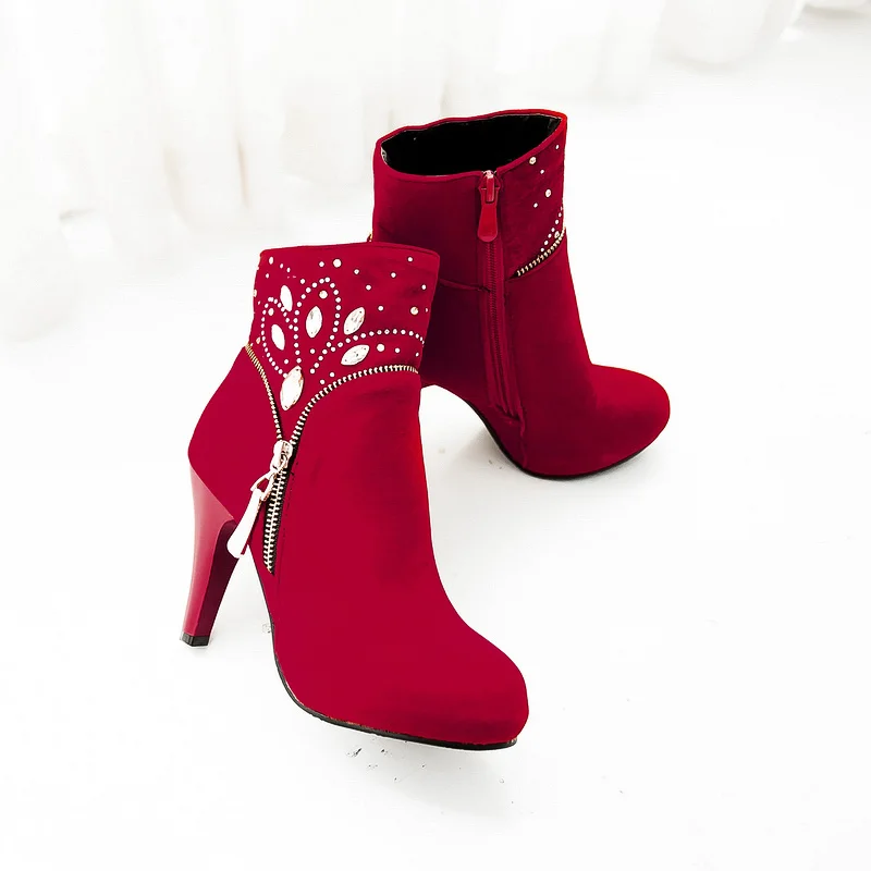 Fashion Women Stiletto Ankle Boots Blue Red Black Flock Rhinestone High Chunky Heels Party Dress Lady Winter Zipper Short Boots