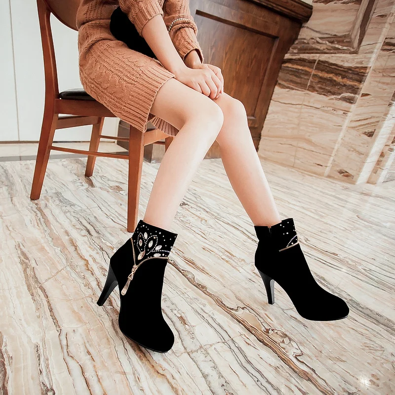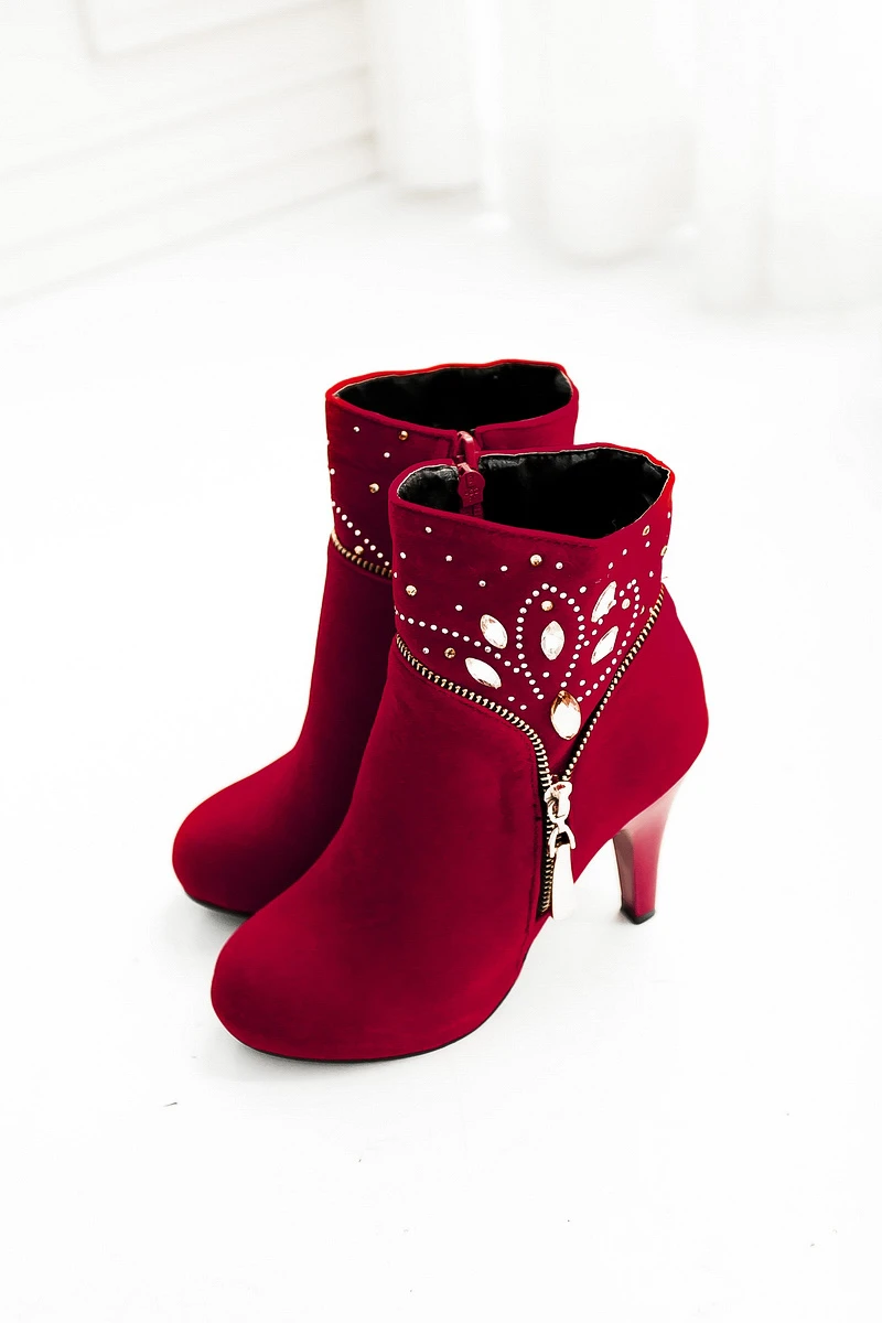 Be the first to review “Fashion Women Stiletto Ankle Boots Blue Red Black Flock Rhinestone High Chunky Heels Party Dress Lady Winter Zipper Short Boots”