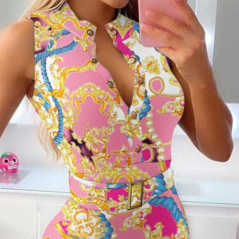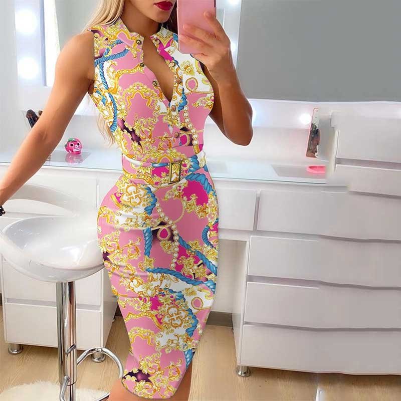 Fashion Women’s Clothing Summer Elegant Round Neck Button Sleeveless Belt Casual Midi Dress Mid Waist Slim A-line Skirt