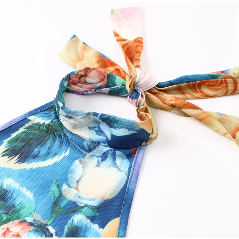 Flora Printed Backless Lace Up Women Party Dress Sexy Halter Sleeveless Sheath Midi Dresses Female Summer Elegant Vestido