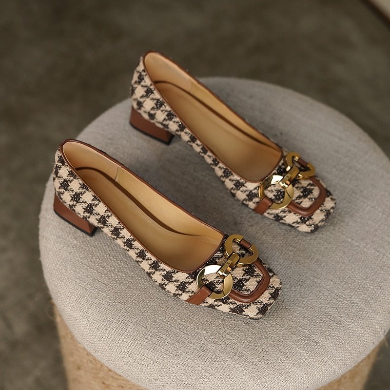 French Fashion Retro Plaid Shoes New Metal Buckle Shallow Mouth All-match Thick Heel Design Women’s Shoes Banquet Dress Up