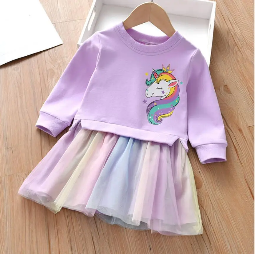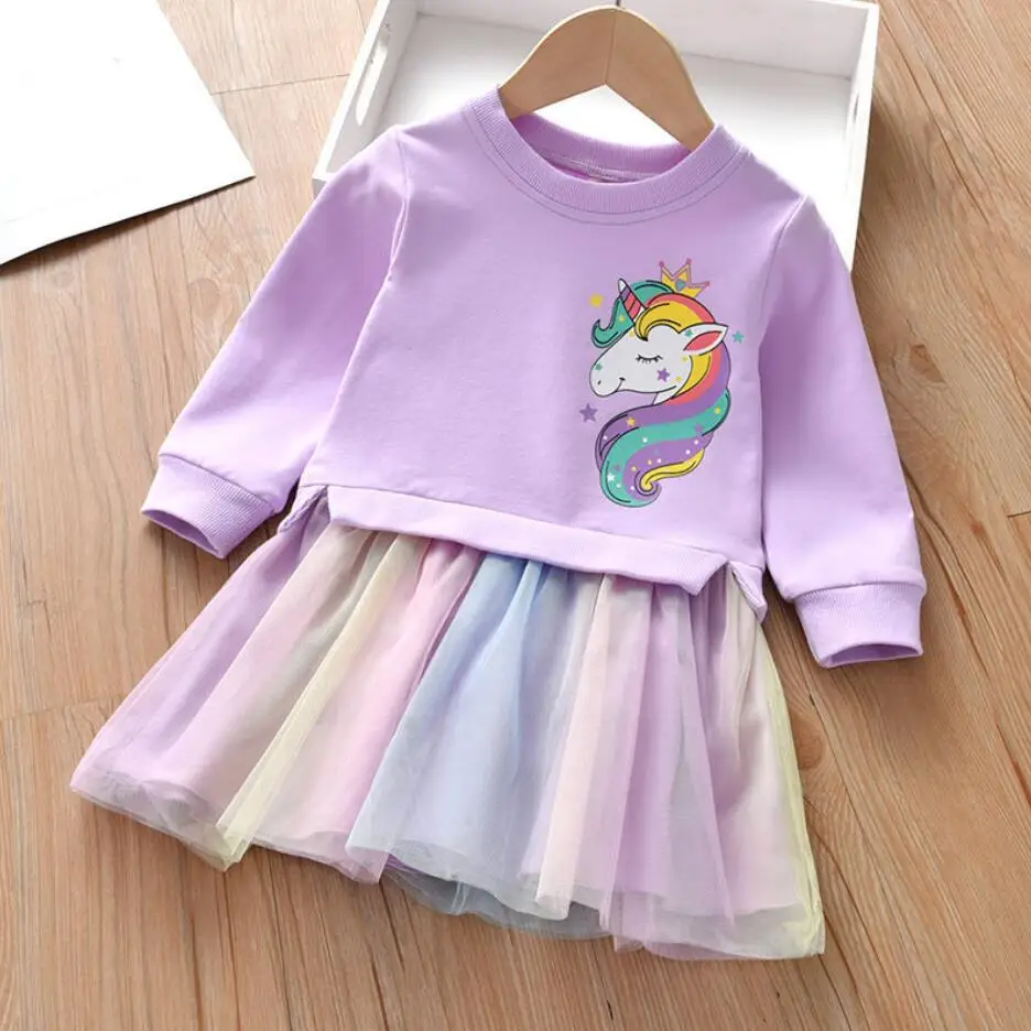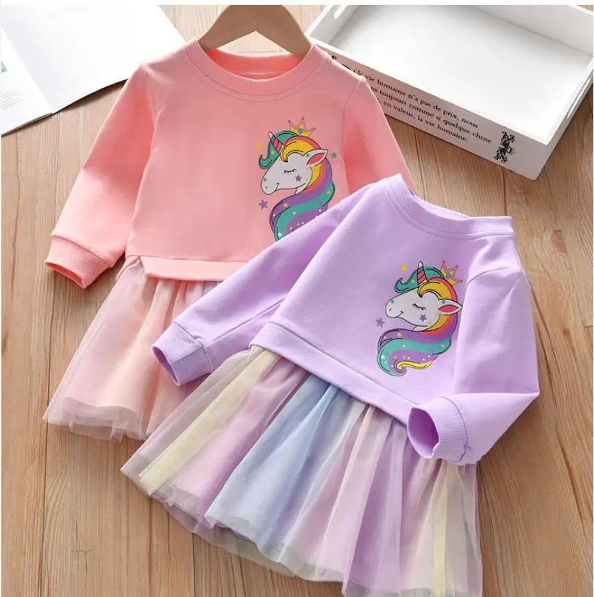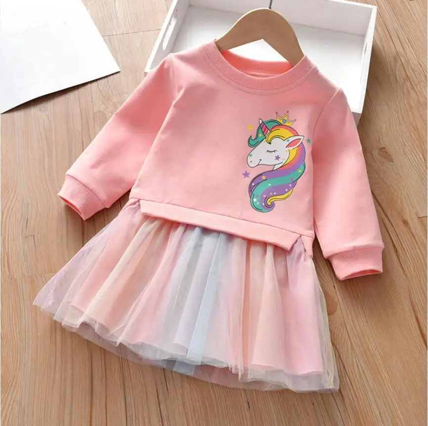 Girl Clothing Autumn New Cartoon Unicorn Printed Long-sleeved Shirt Stitching Rainbow Mesh Princess Dress for 2 3 4 5 6 Years