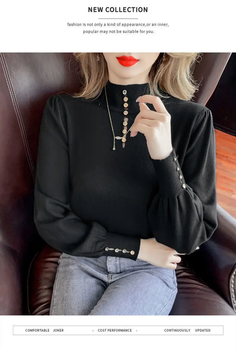Half Turtleneck Sweater Solid Color Spring Autumn Bottoming Shirt Puff Sleeves Hollow Long-sleeved Loose Knitted Top Women