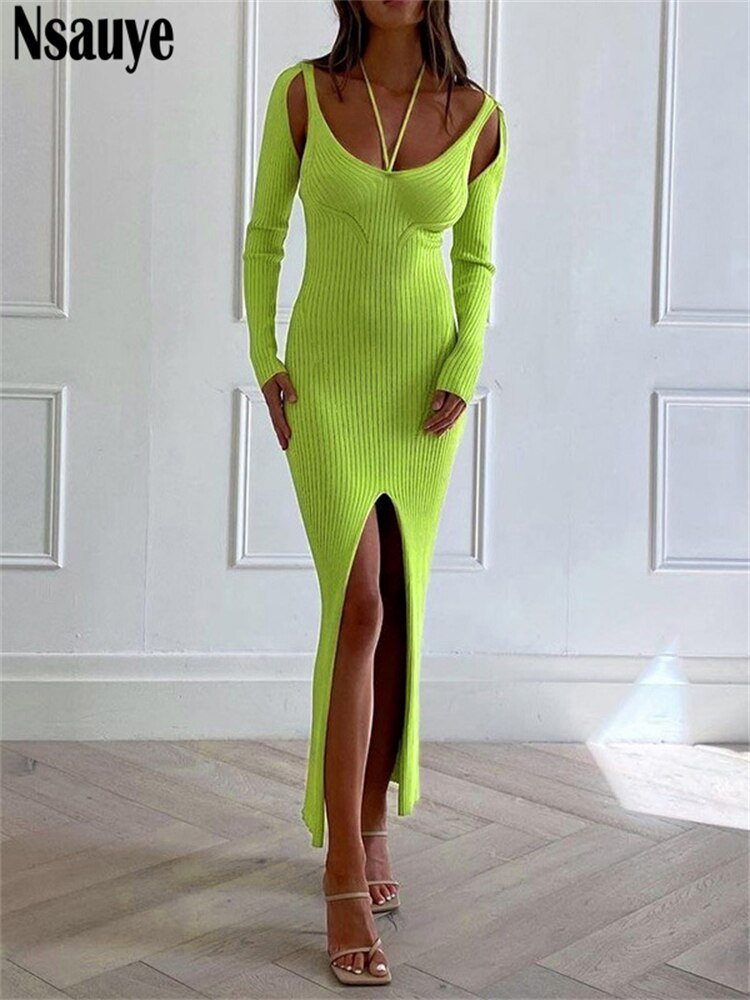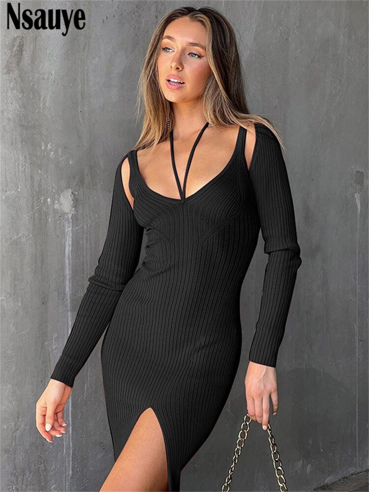 Knitted Bodycon Autumn Midi Dress Women Halter Winter Long Sleeve Sexy Fashion Black Night Club Dress Party Outfits