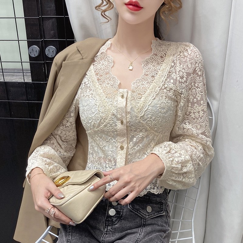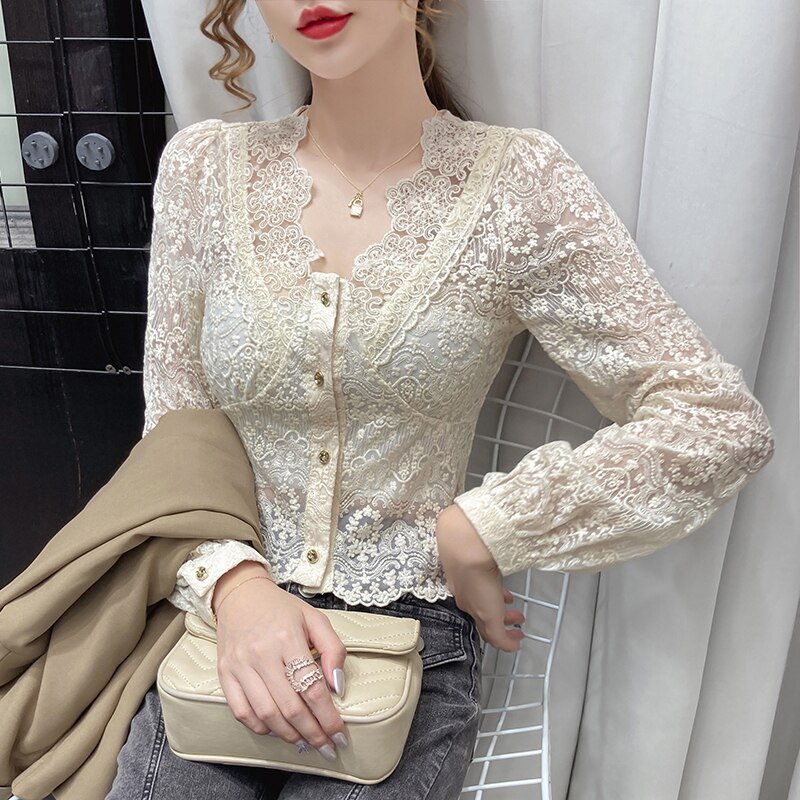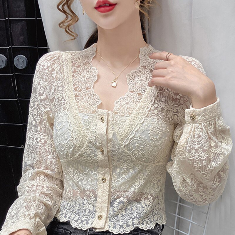Long Sleeve V-Neck Blouse Women Blusas Mujer De Moda Apricot Hollow Lace Blouse Shirt Tops Women Blusa Women Clothing