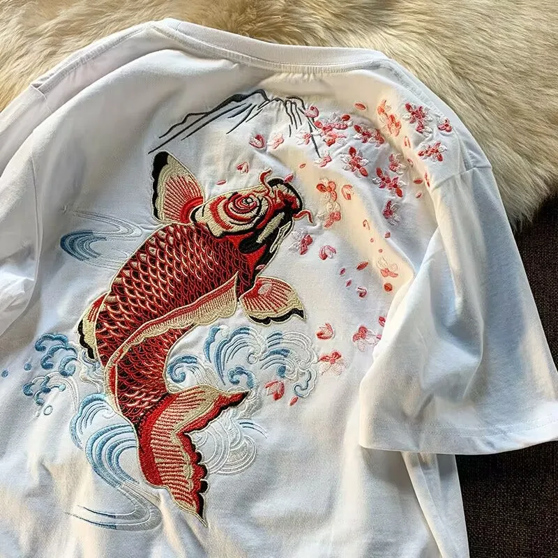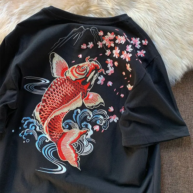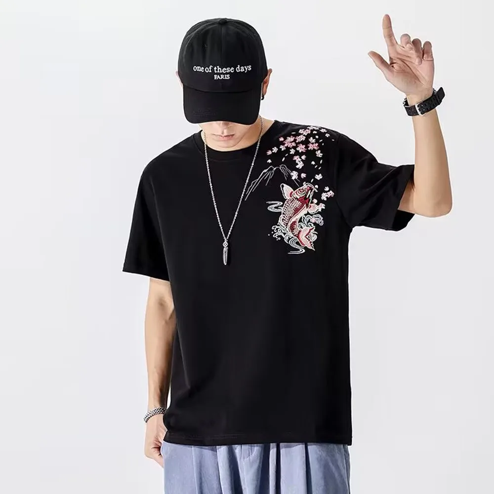 Lovers Embroidered Koi Fish Summer T-shirt Men Cotton T Shirt Students Casual Tee Short Sleeves Top Loose T-shirt 4XL