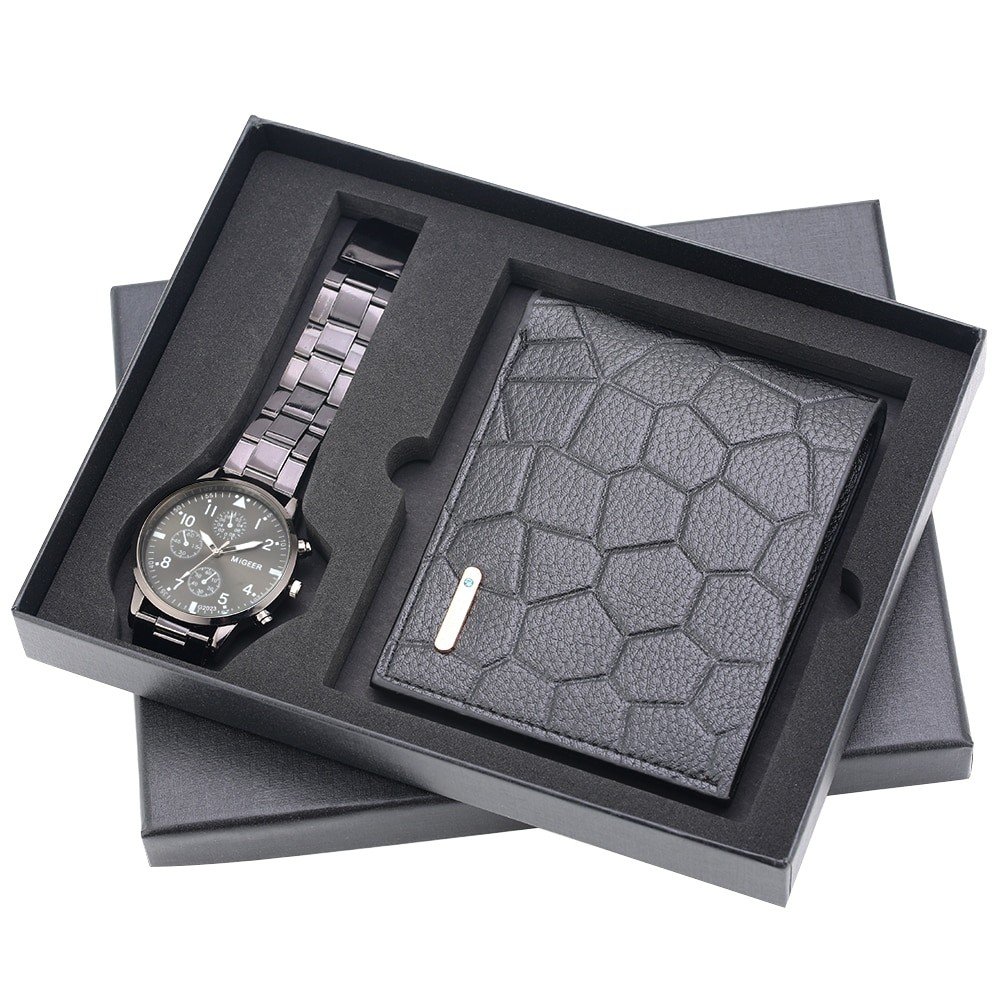 Men Watch Wallet Set Black Quartz Digital Dial Stainless Steel Strap Fold Buckle Leather Wallet Purse Gift Box for Husband Male